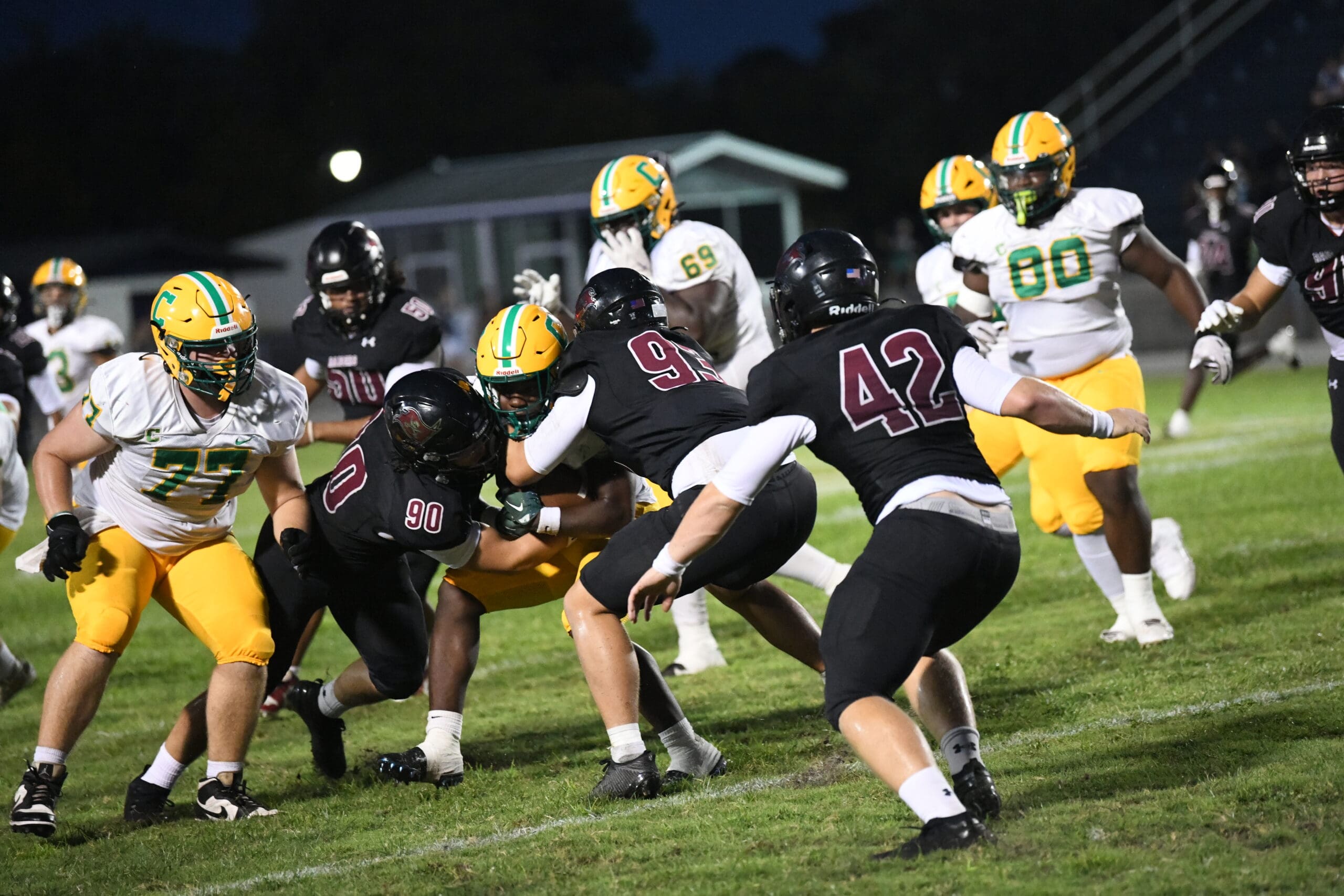 Bryce Wheeler (90) and Matthew Lee (93) make a tackle in a game against Catholic earlier this season.
