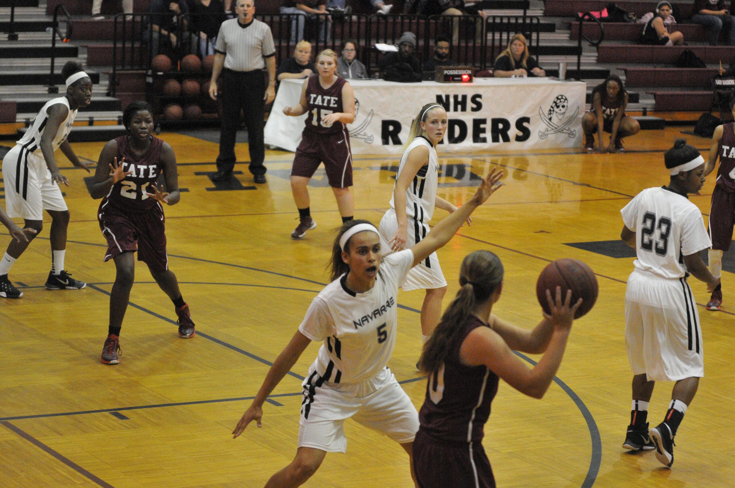 Amber Leggett tries to prevent a Tate player from making a pass during Tuesday’s district game at Navarre.