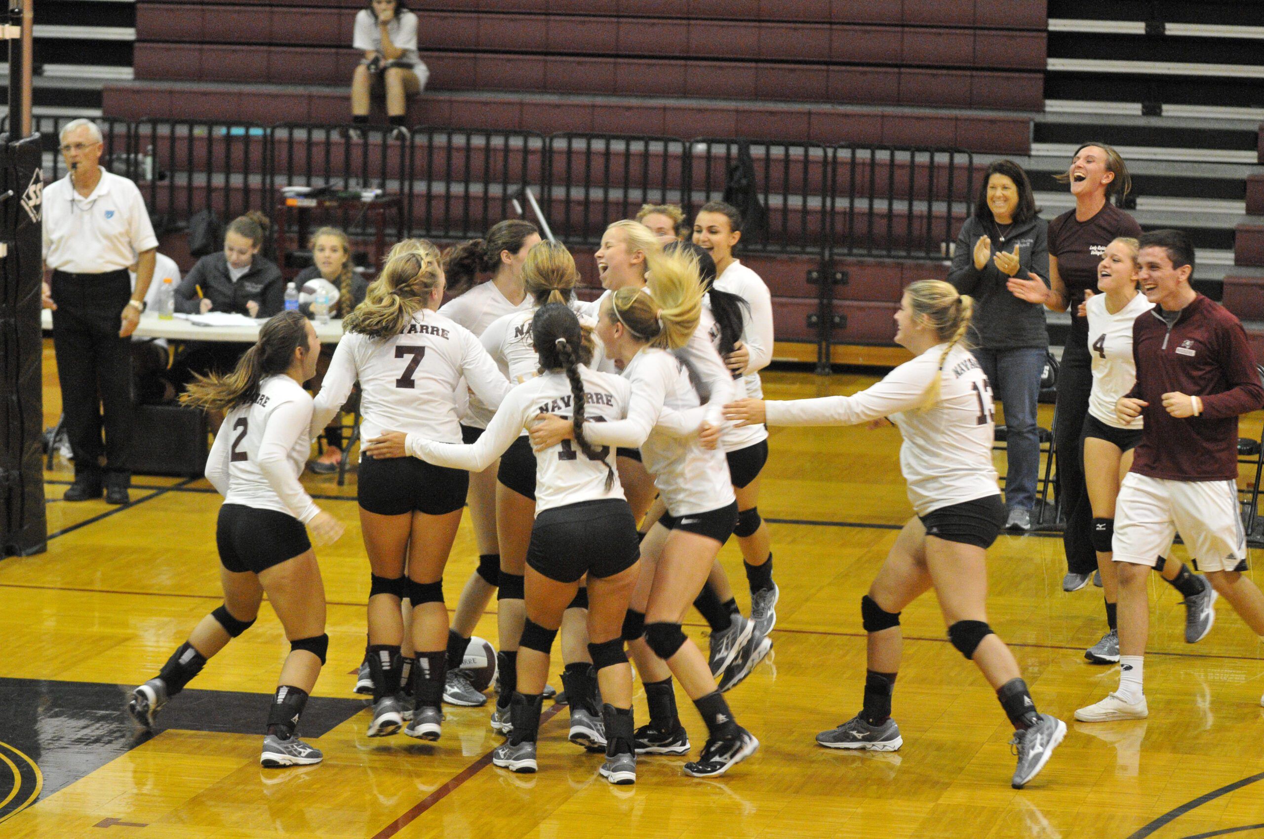 Navarre’s volleyball team celebrates its four-game win over county rival Milton Thursday night.