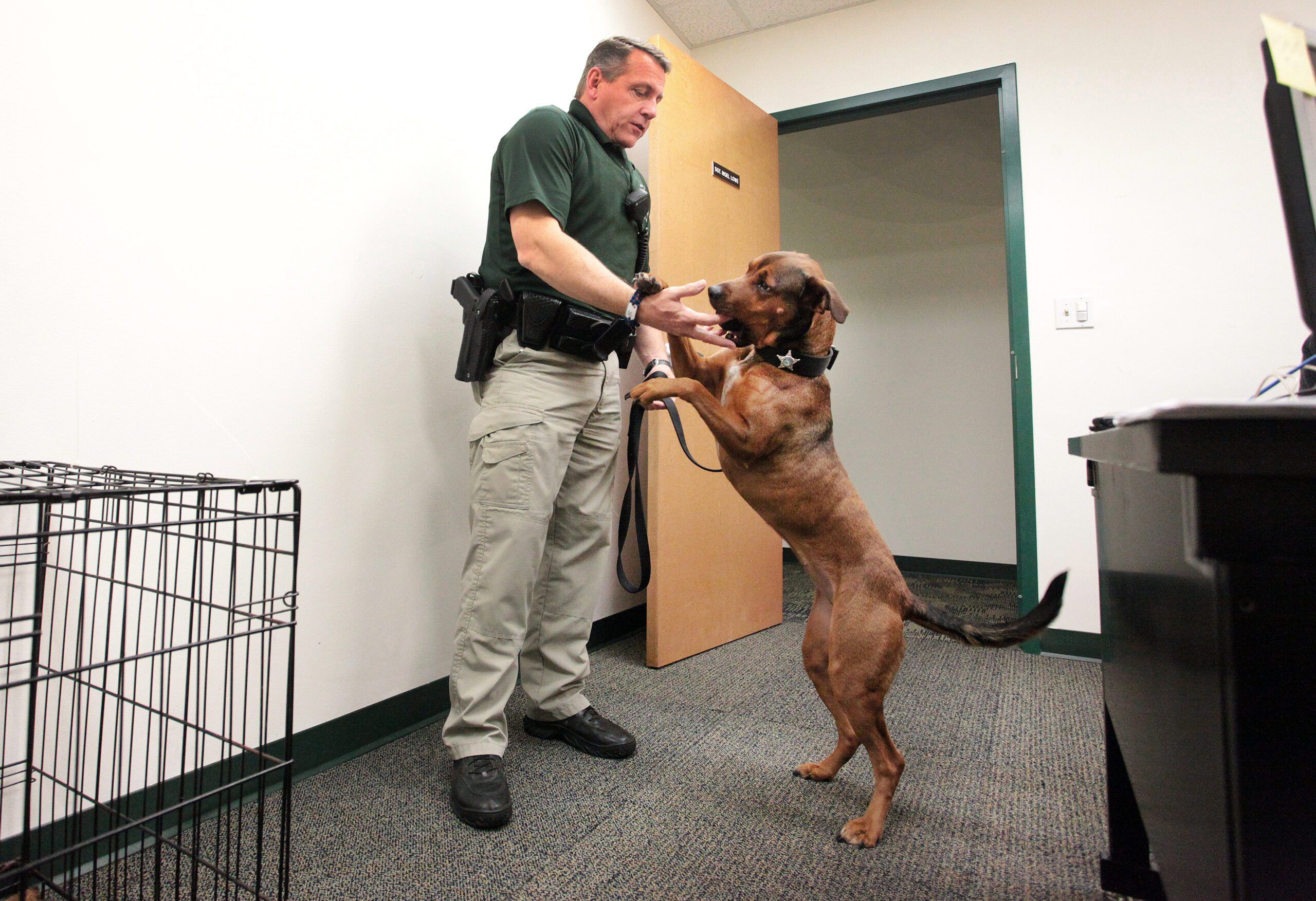 Alachua County Sheriff’s Office Sgt. Nigel Lowe, left, is the handler of the recently adopted rescue hound, Zoey, shown in Lowe’s office at the ACSO in Gainesville, Fla. Zoey was due for euthanasia, but joined the K-9 unit after being rescued by a group in Texas. Sgt. Lowe uses the drug sniffing K-9 at several area middle and high schools.
