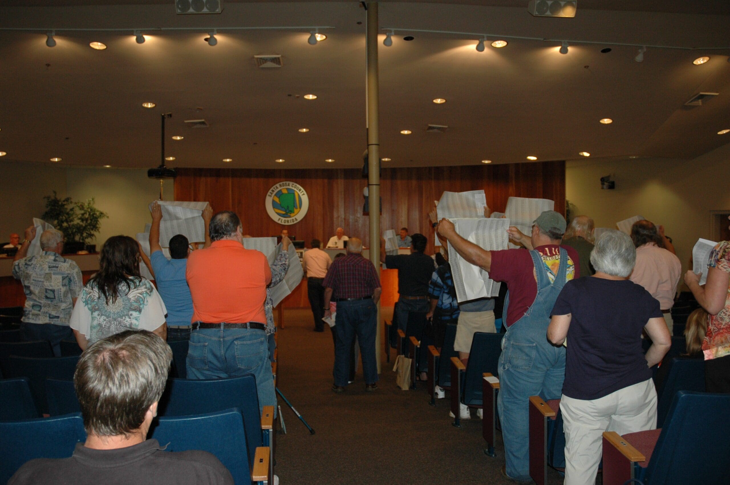 Tea Party supporters held up tax certificate sale notices to demonstrate locals cannot afford property taxes at the first county budget hearing Sept. 3