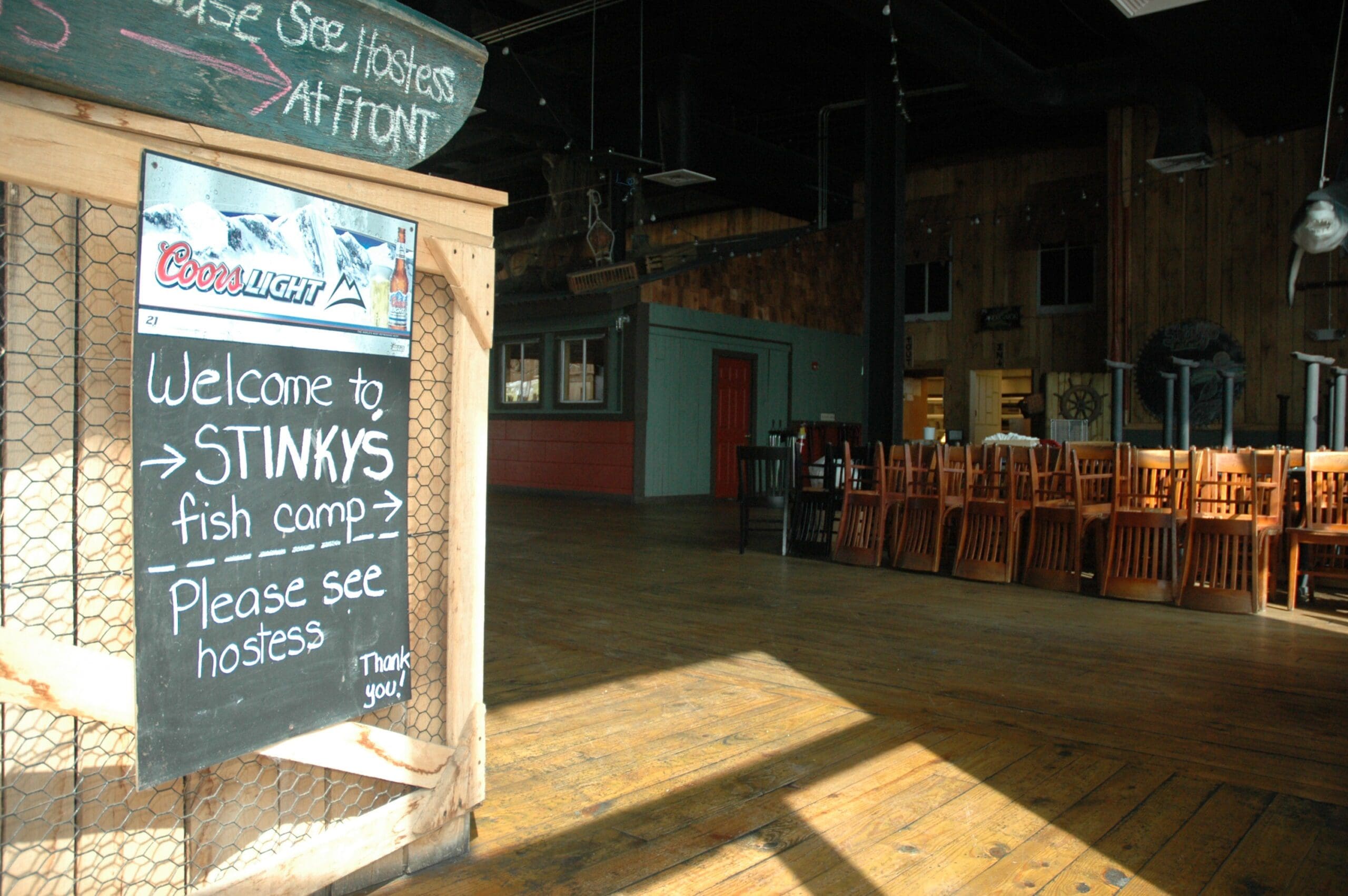 Chairs are neatly stacked in the space previously occupied by Stinky’s Fish Camp. The restaurant closed last week.