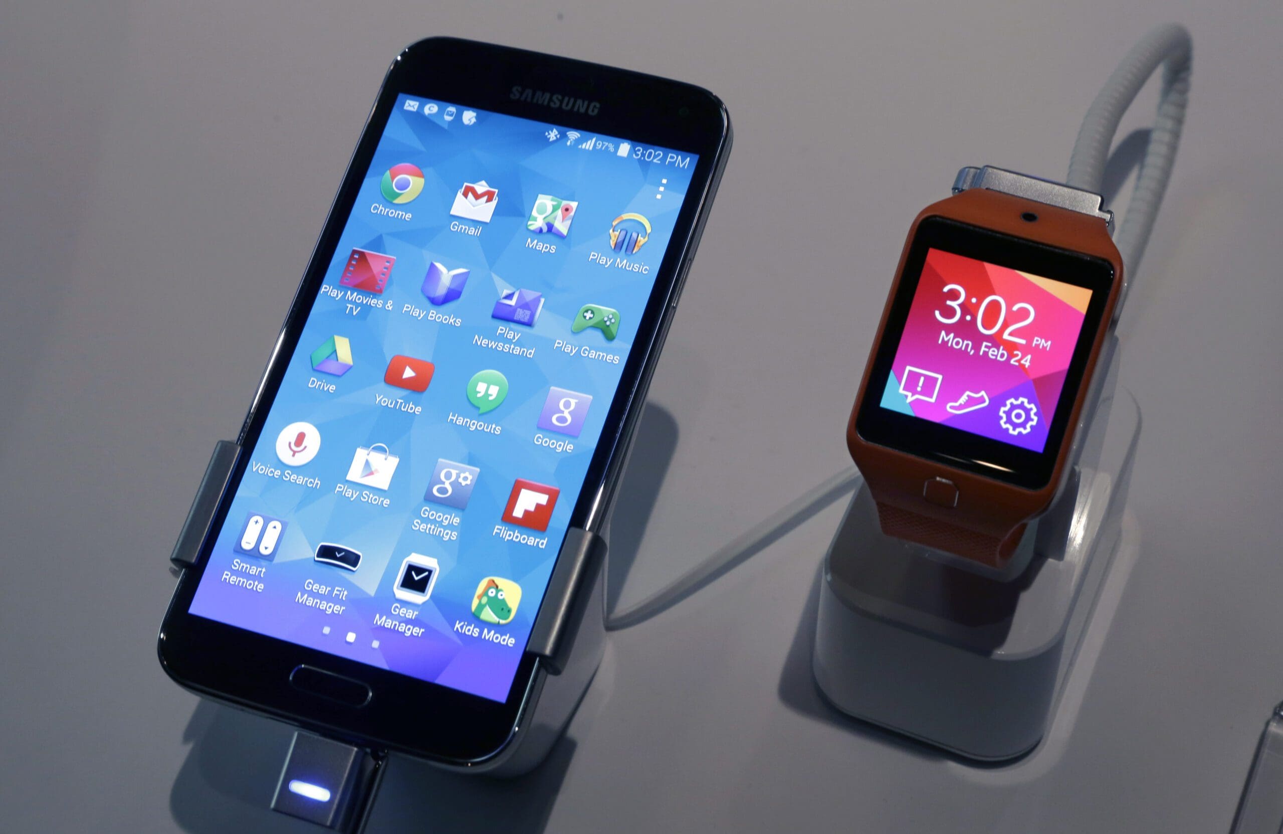 A Samsung Galaxy S5 smartphone, left, and a Samsung Gear 2 are displayed at the Samsung Galaxy Studio, in New York, Monday, Feb. 24, 2014. Samsung on Monday unveiled a new smartphone with a built-in heart rate monitor to complement three upcoming fitness devices, as the Korean company tries to turn its technological wizardry into lifestyle products. (AP Photo/Richard Drew)