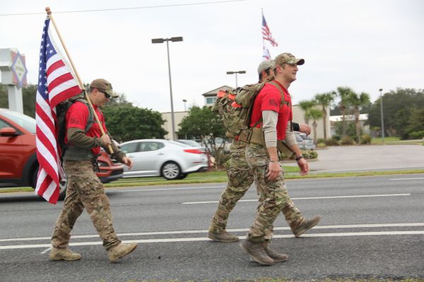 A trio of Air Force Special Tactics operators marched along U.S. Highway 98 through Navarre Monday morning along an 830-mile ruck march route from Lackland Air Force Base, Texas to Hurlburt Field.