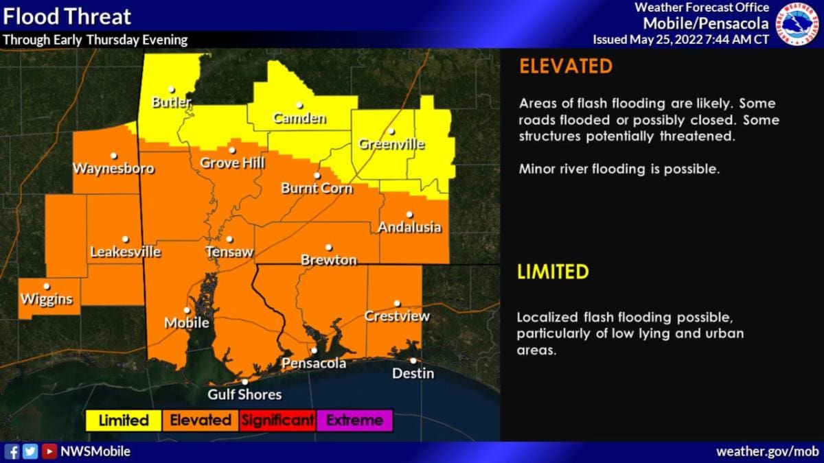 Heavy rainfall and localized flash flooding, particularly of low lying and urban areas, is possible beginning today, Wed., May 25, through the evening of Thurs., May 26 along with a tornado threat through Thursday morning, according to the US National Weather Service in Mobile.
