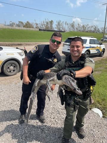 Santa Rosa Sheriff’s Office deputy, Michael Ramirez, right, holds gator removed from a Louisiana neighborhood this past weekend. Ramirez is one of 10 deputies helping in Louisiana this week. Submitted photo.