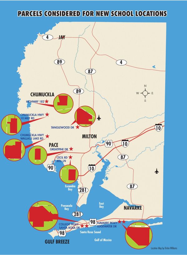 This map shows the Santa Rosa School District parcels that could be used to build schools for the future.
