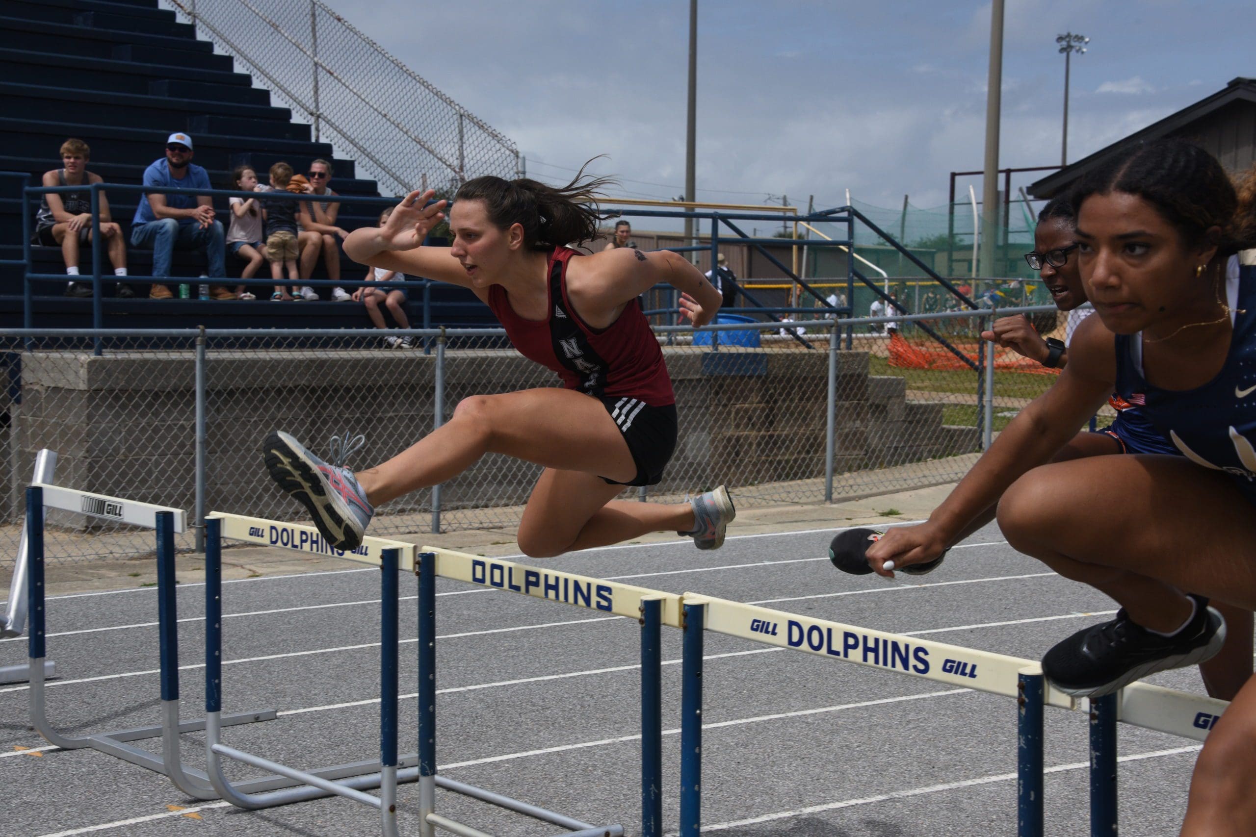 Alina Schorzman leaps over the hurdle at the Andrews Invitational in Gulf Breeze.