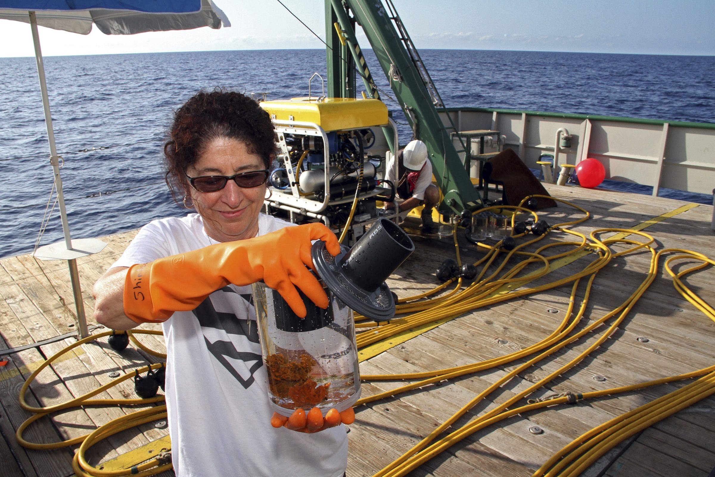 In this photo provided by Florida Atlantic University/Harbor Branch Oceanographic Institute/South Florida Sun-Sentinel, a scientist on the Gulf of Mexico places a sponge in a jar to be tested. Florida Atlantic University scientists have developed a sophisticated device that allows them to inspect ocean reefs and collect sponges with chemicals to fight an array of diseases, from Alzheimer’s to cancer.