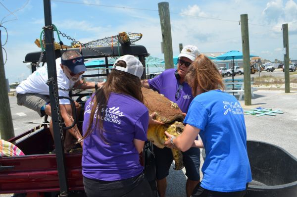 Navarre Beach Sea Turtle Conservation Center (NBSTCC) stranding team and workers share the weight of the 200-pound sea turtle. Photo by Kaitie Kiger