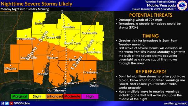 • Severe weather conditions are forecasted in the overnight hours of Monday night (Jan. 8) into Tuesday morning (Jan. 9) for our area. Santa Rosa County has been placed under an enhanced risk for severe weather.