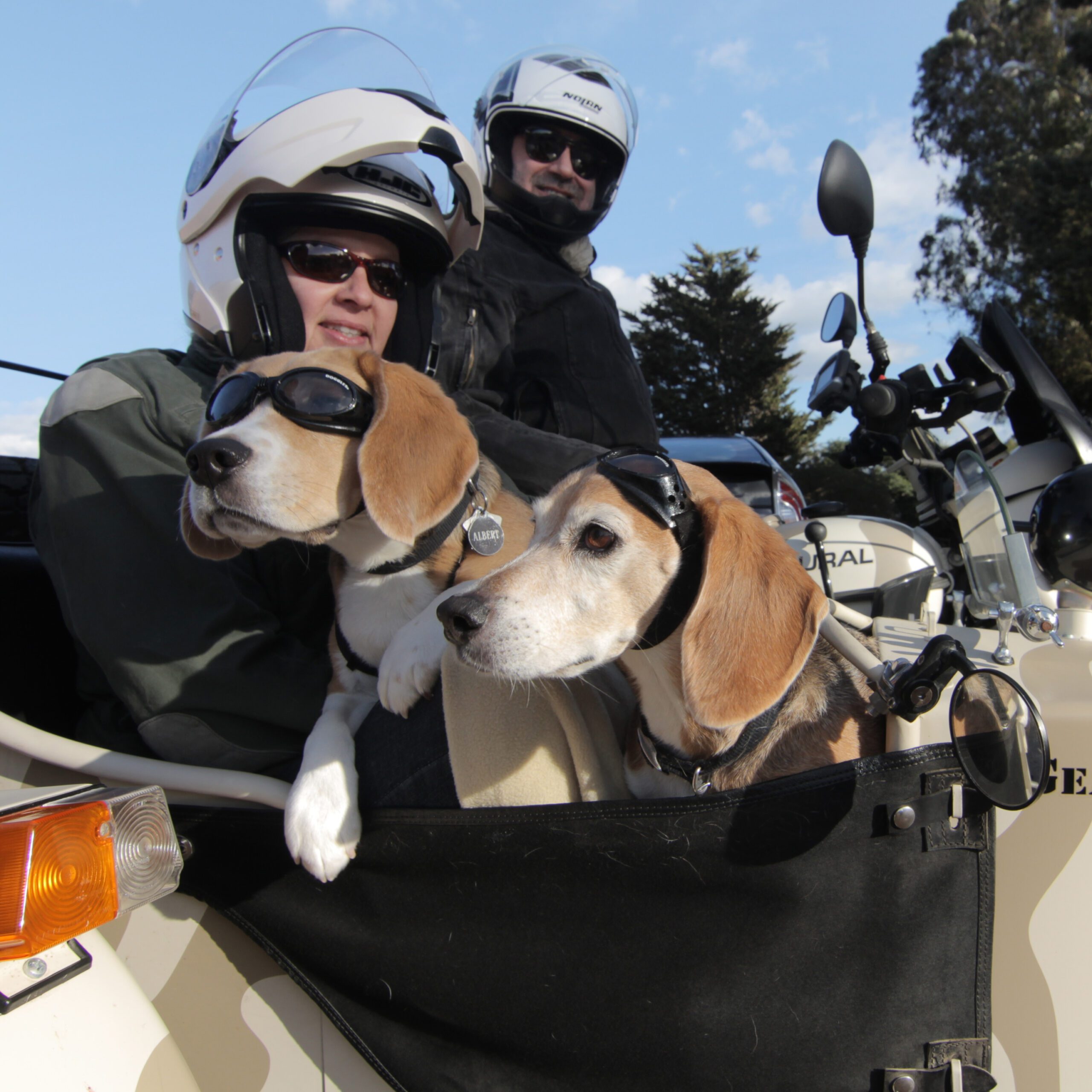 This Sept. 24, 2014, photo provided by Eric Risau shows Regitze Murat, left, and Philippe Murat with their Beagles Albert and Fernand in their 2010 Ural Gear Up motorcycle in San Francisco. These dogs are set apart by speed instead of breed and like to fly like the wind in a blimp-shaped bucket attached to the side of a motorcycle. They are highway sidekicks and the stars of “Sit Stay Ride: The Story of America’s Sidecar Dogs,” by filmmakers Eric, 38, and Geneva, 29, Ristau of Missoula, Montana. (AP Photo/Geneva Ristau)