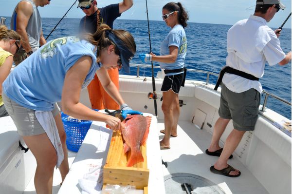 Stephanie Freed vents a red snapper. Photo taken on a tagging trip, April 3, 2012, off the coast of Panama City. By Amanda Nalley