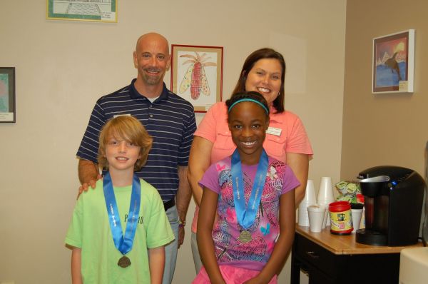 West Navarre Intermediate School Principal David Crissey (top, left) and Assistant Principal Shana Dorsey (top, right) proudly pose with Tropicana Speech Contest winners Brandon Boynton (bottom, left) and Taylor Smith (bottom, right.)