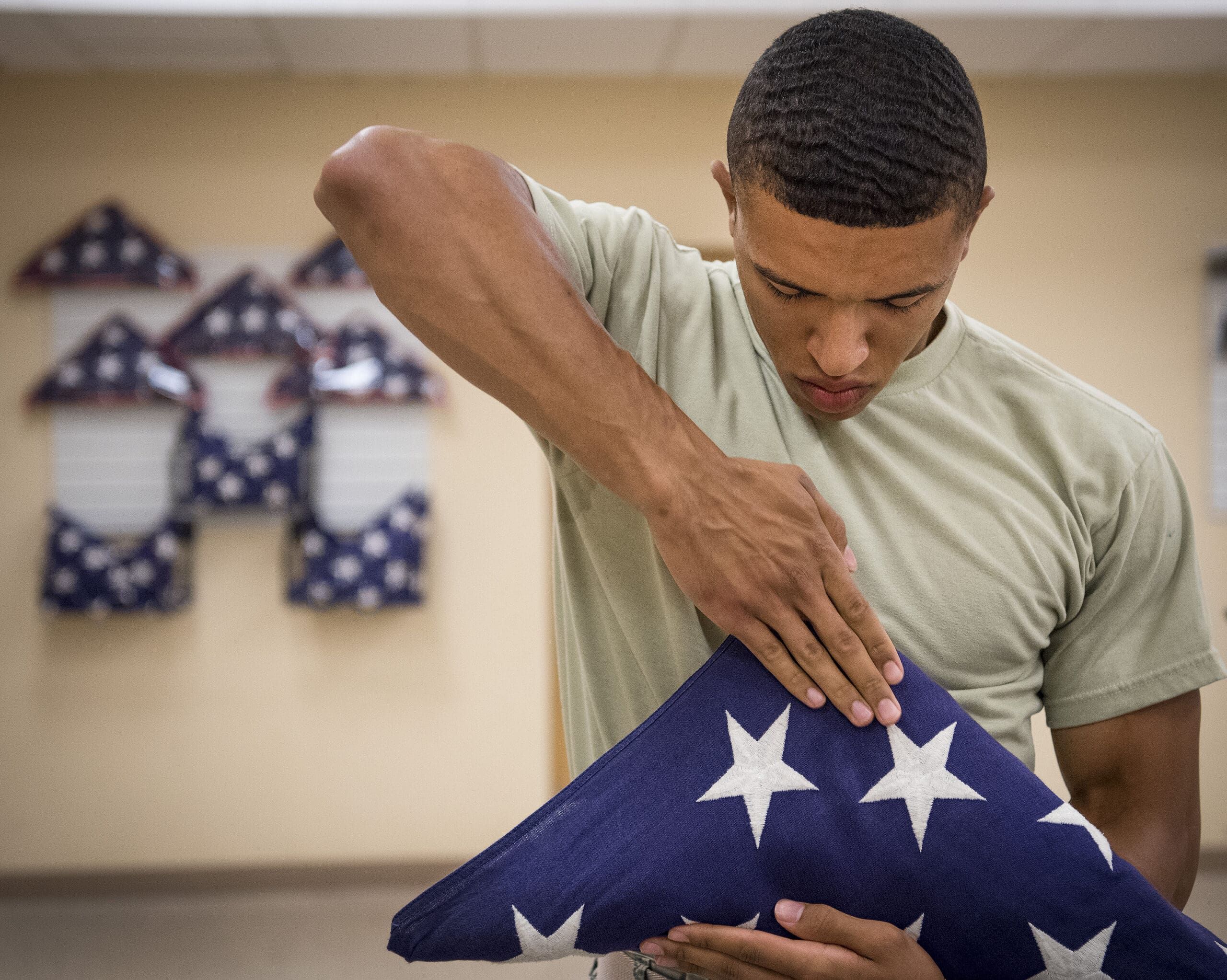 Airman 1st Class Joshua Alvord, 1st Special Operations Wing, performs a flag folding procedure during an honor guard training session April 2 at Eglin Air Force Base, Fla. The Air Force Honor Guard mobile training team visited the base to provide a 10-day standardized training course to 31 local honor guard Airmen. The goal is to ensure all honor guard units perform the required ceremonial procedures the same way throughout the Air Force. (U.S. Air Force photo/Samuel King Jr.)