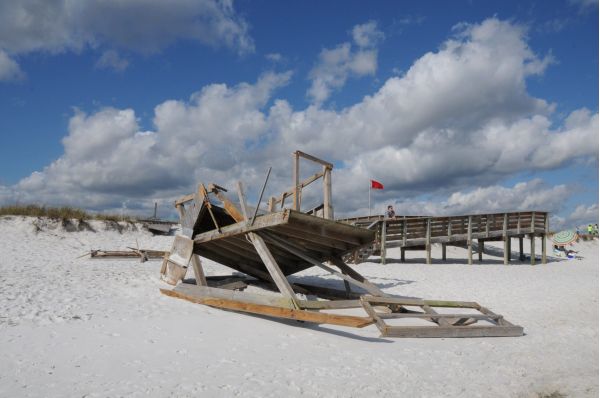Three out of four Navarre Beach lifeguard stands were destroyed by strong winds Friday.