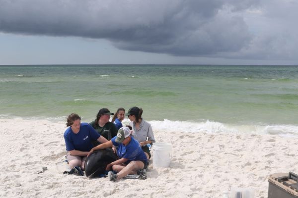 Members of the Marine Mammal Stranding Team support a melon-headed whale that stranded at Fort Pickens this summer. The whale was very sick and did not survive. Submitted photo