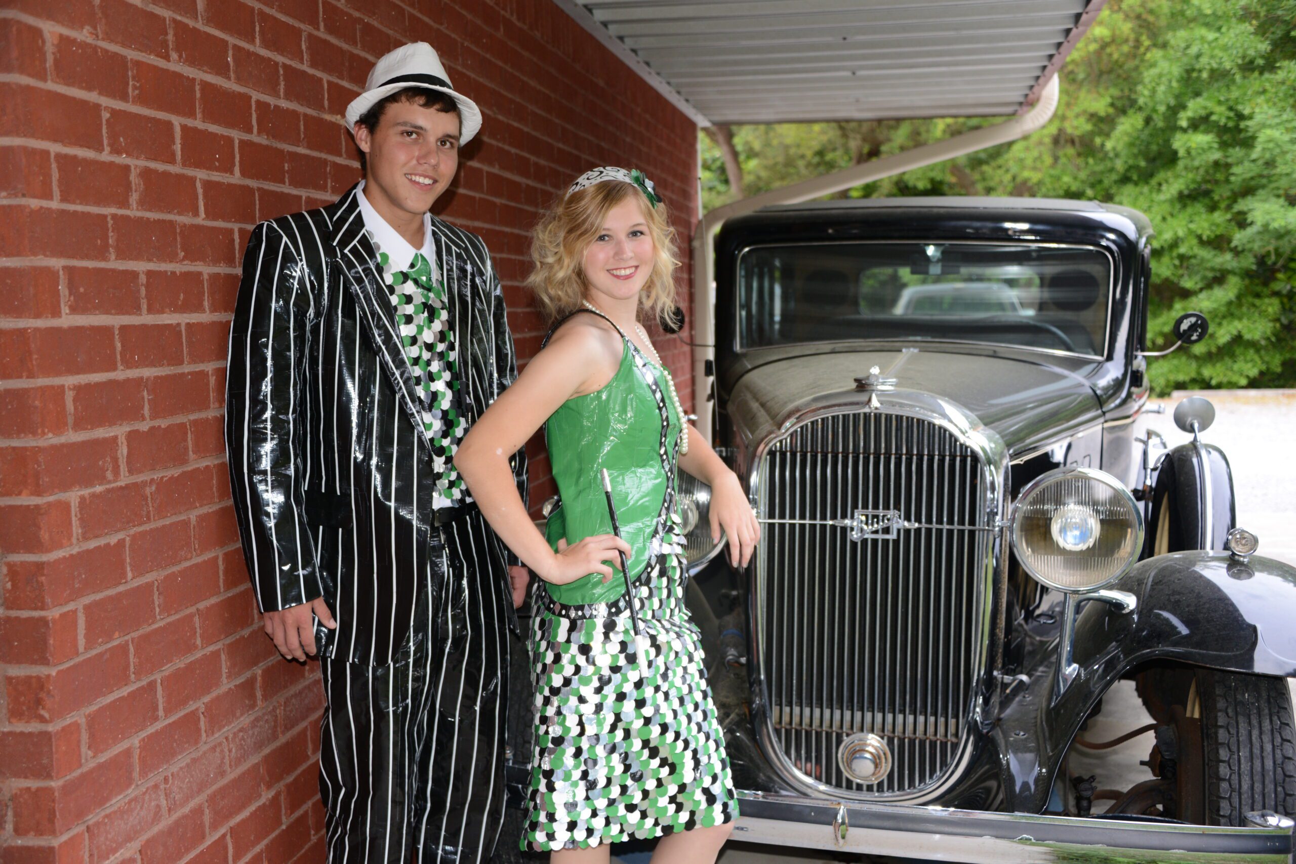 Chloey Guy and Aaron Streacker pose in May at their prom in their outfits made using 21 rolls of Duck brand duct tape.