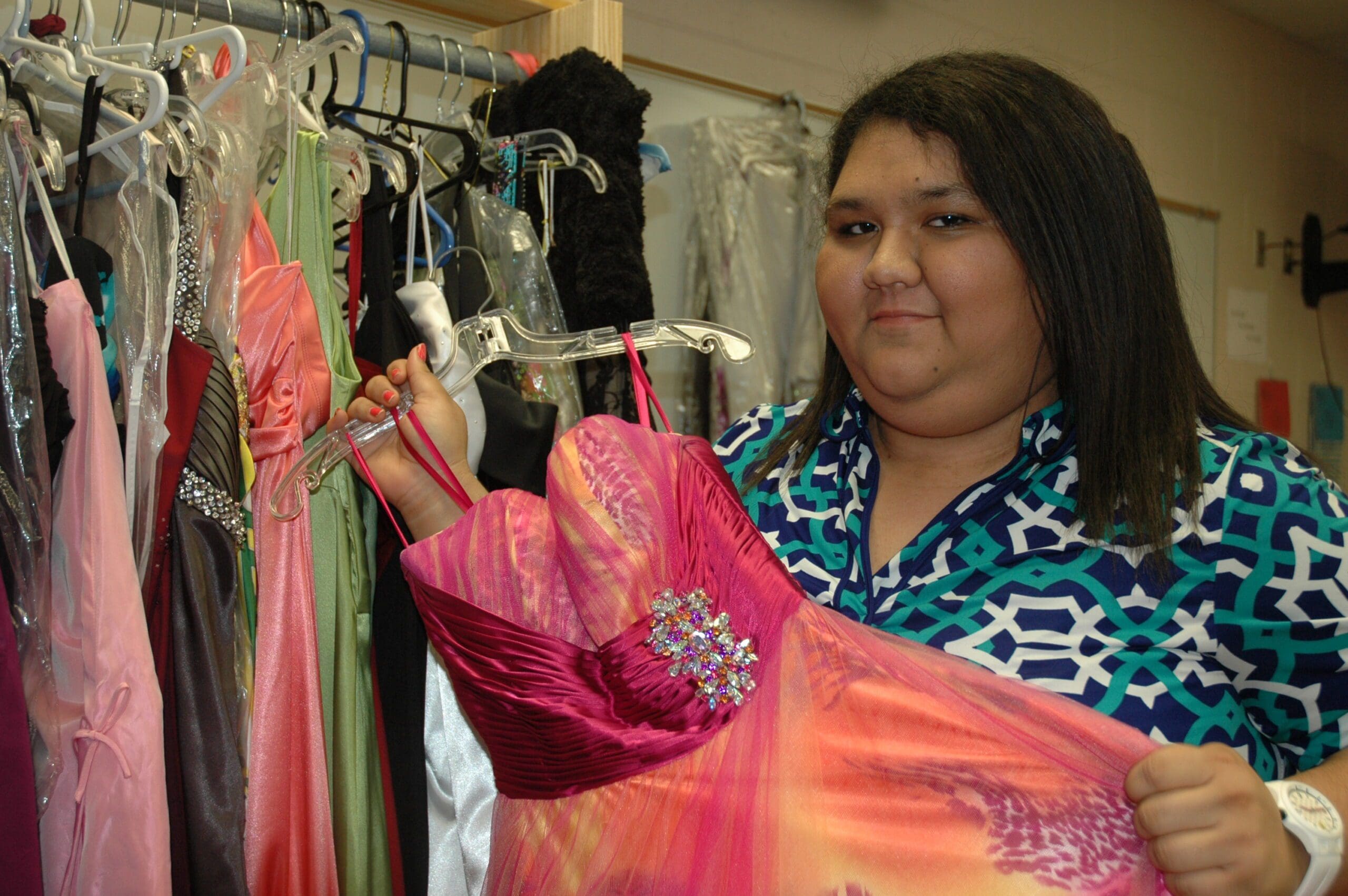Navarre High sophomore Mariah Whitworth shows off a donated dress. Prom dresses can be donated at Navarre High School in the front office through April 11.