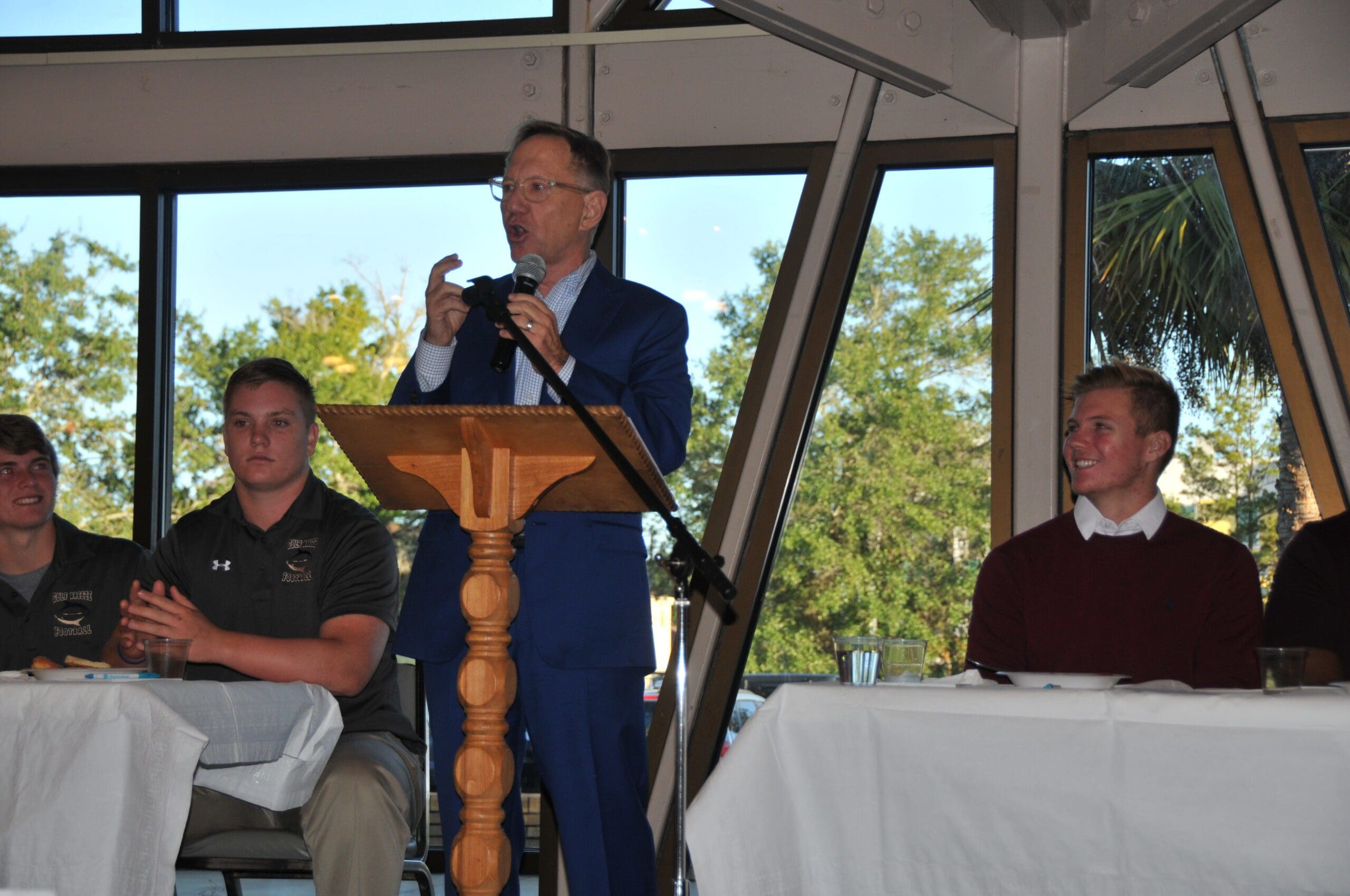 Florida businessman and philanthropist Quint Studer talked to the players, the coaches and members of the community on hand at the Rivalry and Respect Breakfast Tuesday morning at St. Ann Catholic Church in Gulf Breeze about a time he gave a eulogy.