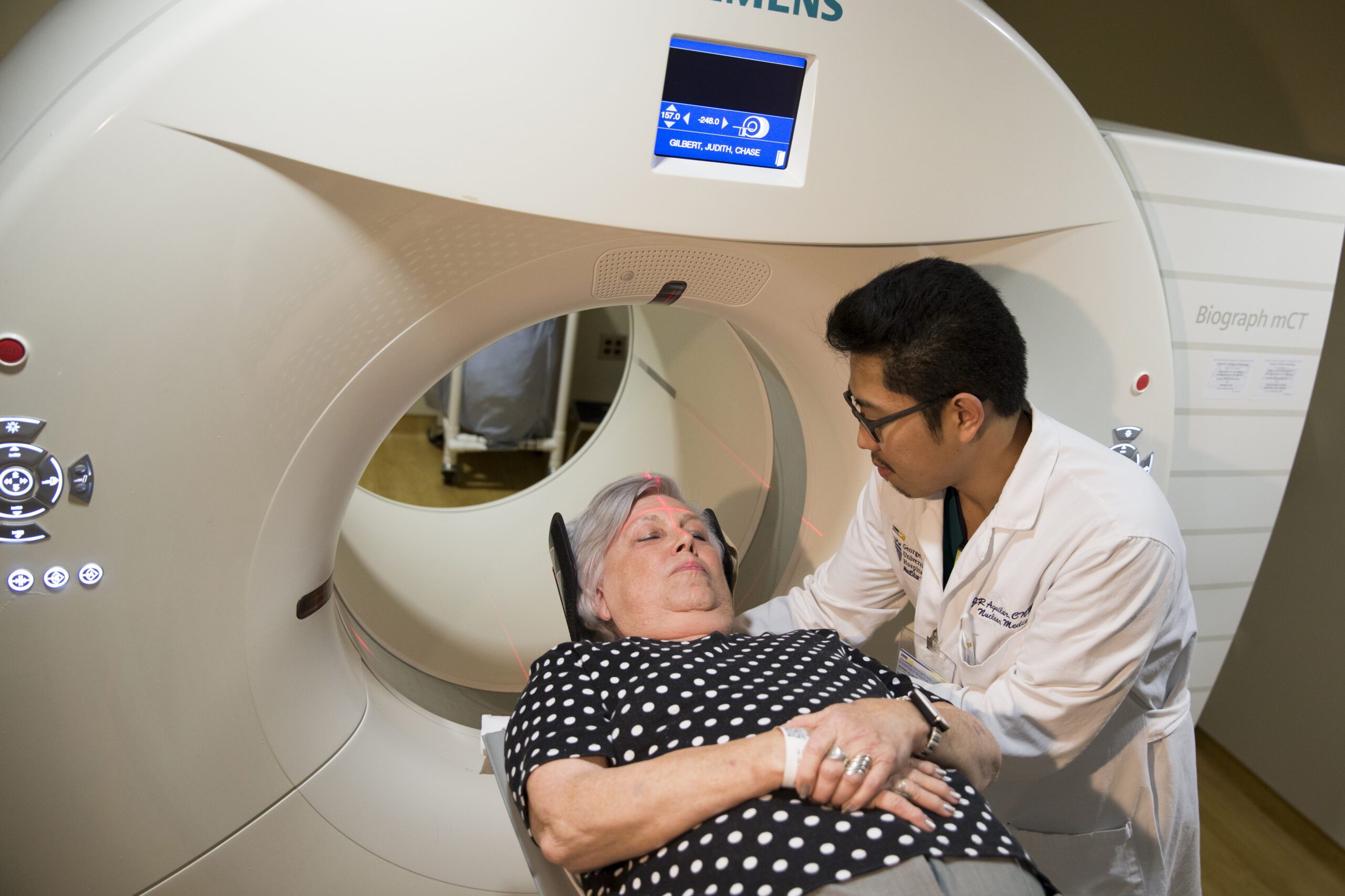 In this May 19 photo, Judith Chase Gilbert, of Arlington, Va., is loaded into a PET scanner by Nuclear Medicine Technologist J.R. Aguilar at Georgetown University Hospital in Washington. Gilbert shows no signs of memory problems but volunteered for a new kind of scan as part of a study peeking into healthy brains to check for clues about Alzheimer’s disease.