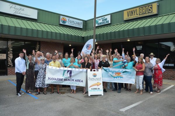 Chamber members from both Navarre Beach Area Chamber of Commerce and Gulf Breeze Area Chamber of Commerce cheer as Suncoast Flooring and Design owners Jeremy and Carrie Carver cut ribbons at their Grand Re-Opening Friday, Sept. 2.