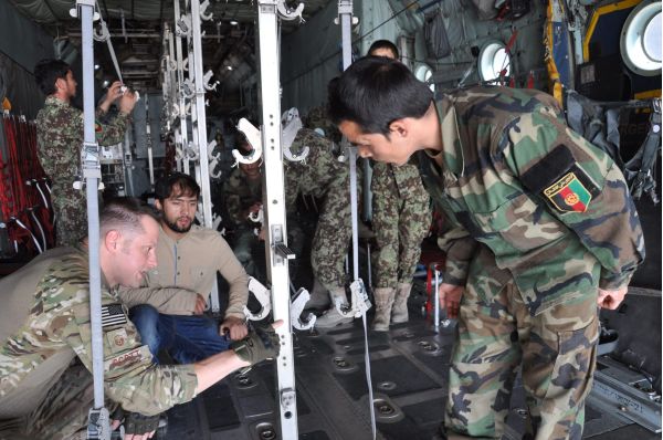 Master Sgt. Matthew Scott (left) points out to an Afghan National Army flight medic the importance of measurement and balance in the metal stanchions in the back of a C-130H Hercules at Hamid Karzai International Airport, July 9, 2015. Scott is an aeromedical evacuation technician and emergency room manager at Eglin Air Force Base, Fla., who is currently the senior enlisted adviser at the nearby NATO clinic in Kabul. (U.S. Air Force photo/Capt. Eydie Sakura/released)