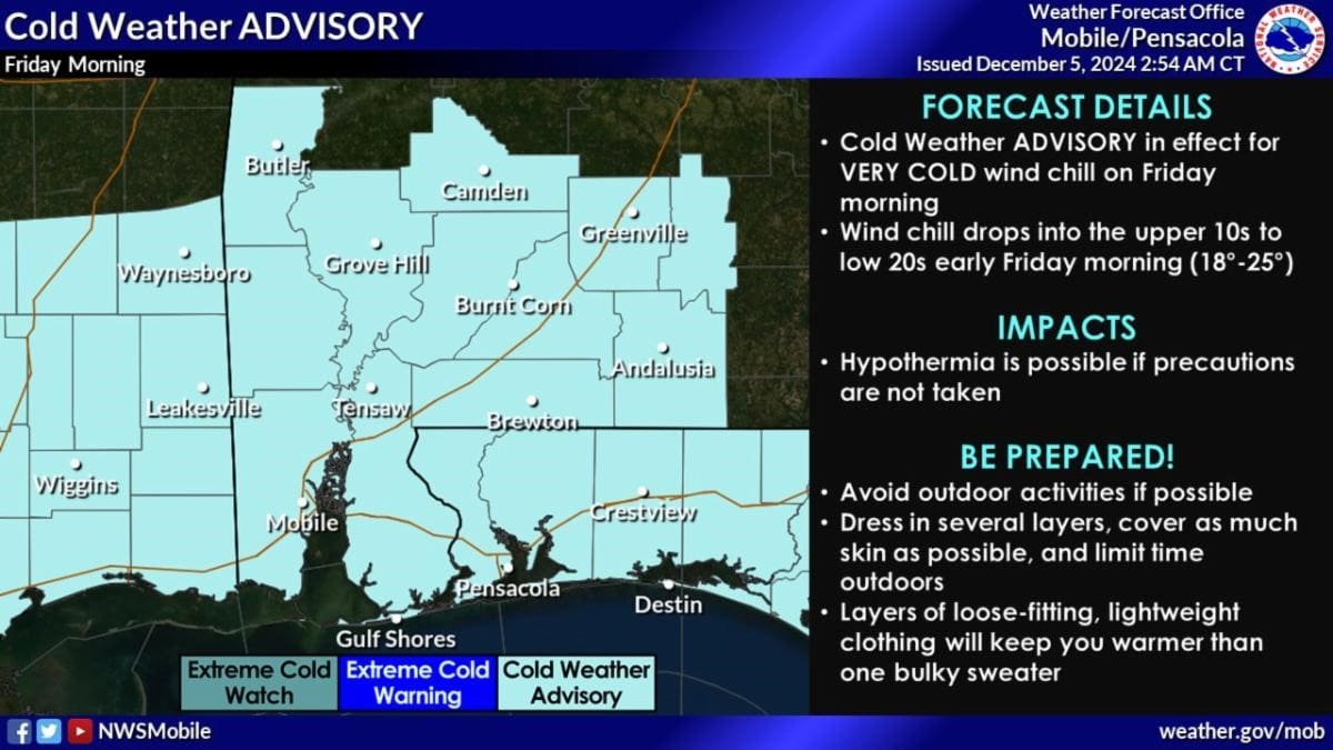Santa Rosa County Public Safety urges residents to be prepared for the cold weather that will settle in late Thursday (Dec. 5) night through Friday (Dec. 6) morning by remembering the 5 P’s of cold w…