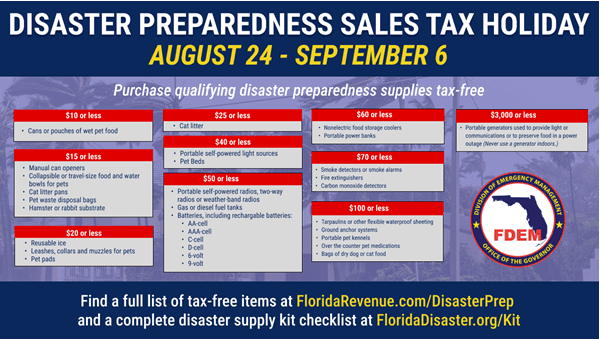 Florida Division of Emergency Management (FDEM) is encouraging Floridians to purchase disaster preparedness items during Florida’s second 14-day Disaster Preparedness Sales Tax Holiday of 2024 runnin…