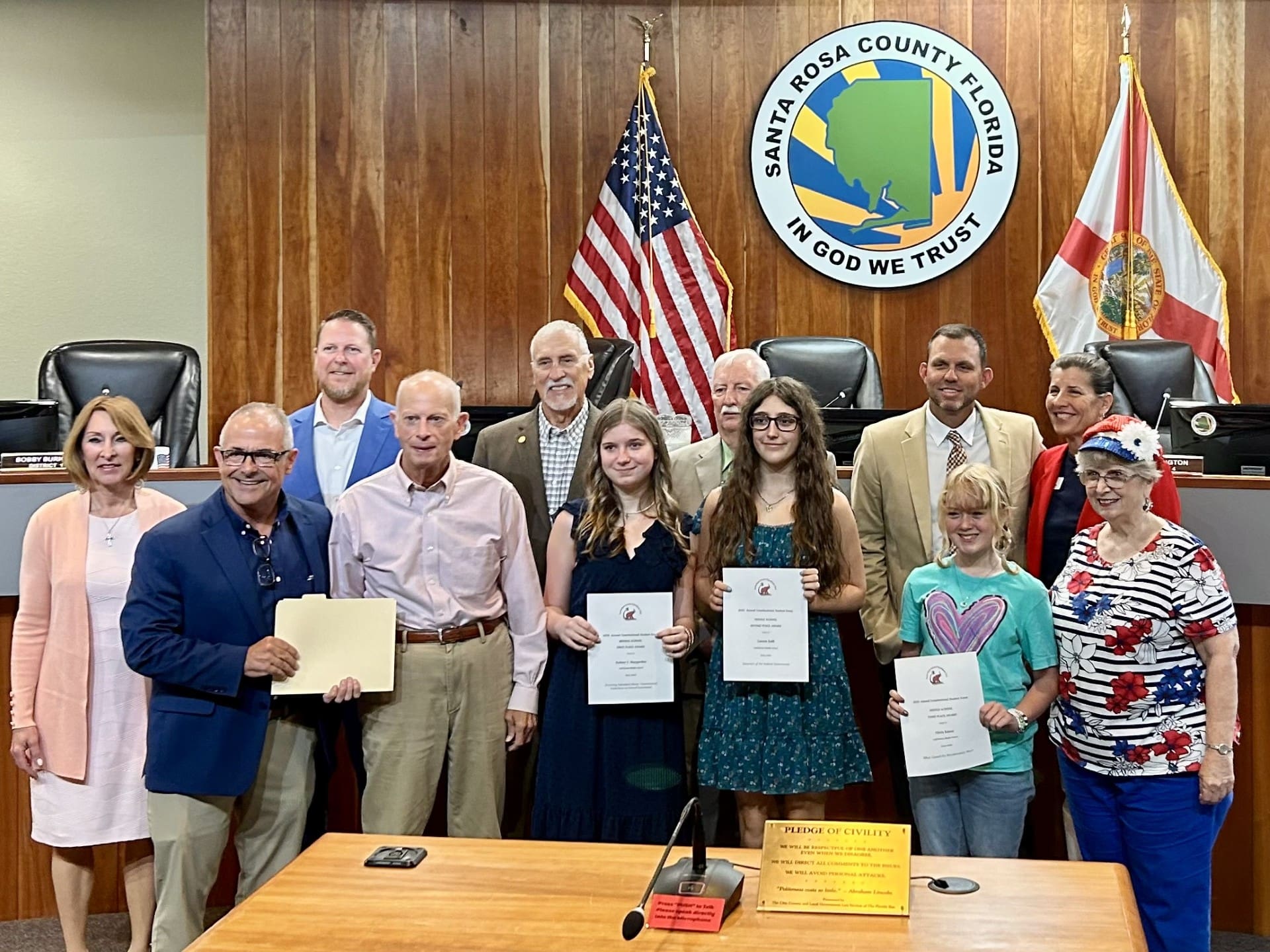 The Santa Rosa County Republican Club’s awarded their annual Constitution Essay Contest winners: Lucas Cannon 9th grade – $1,000 (not present), Sydney F. Maygarden 8th grade – $500, Lauren Kalb 8th g…