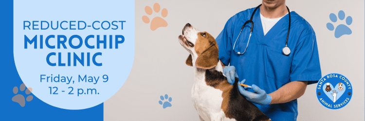 Santa Rosa County Animal Services (SRCAS) is hosting a reduced-cost microchip drive-through clinic on Friday, May 9 from 12 – 2 p.m. at Santa Rosa County Animal Services, 4451 Pine Forest Road in Mil…