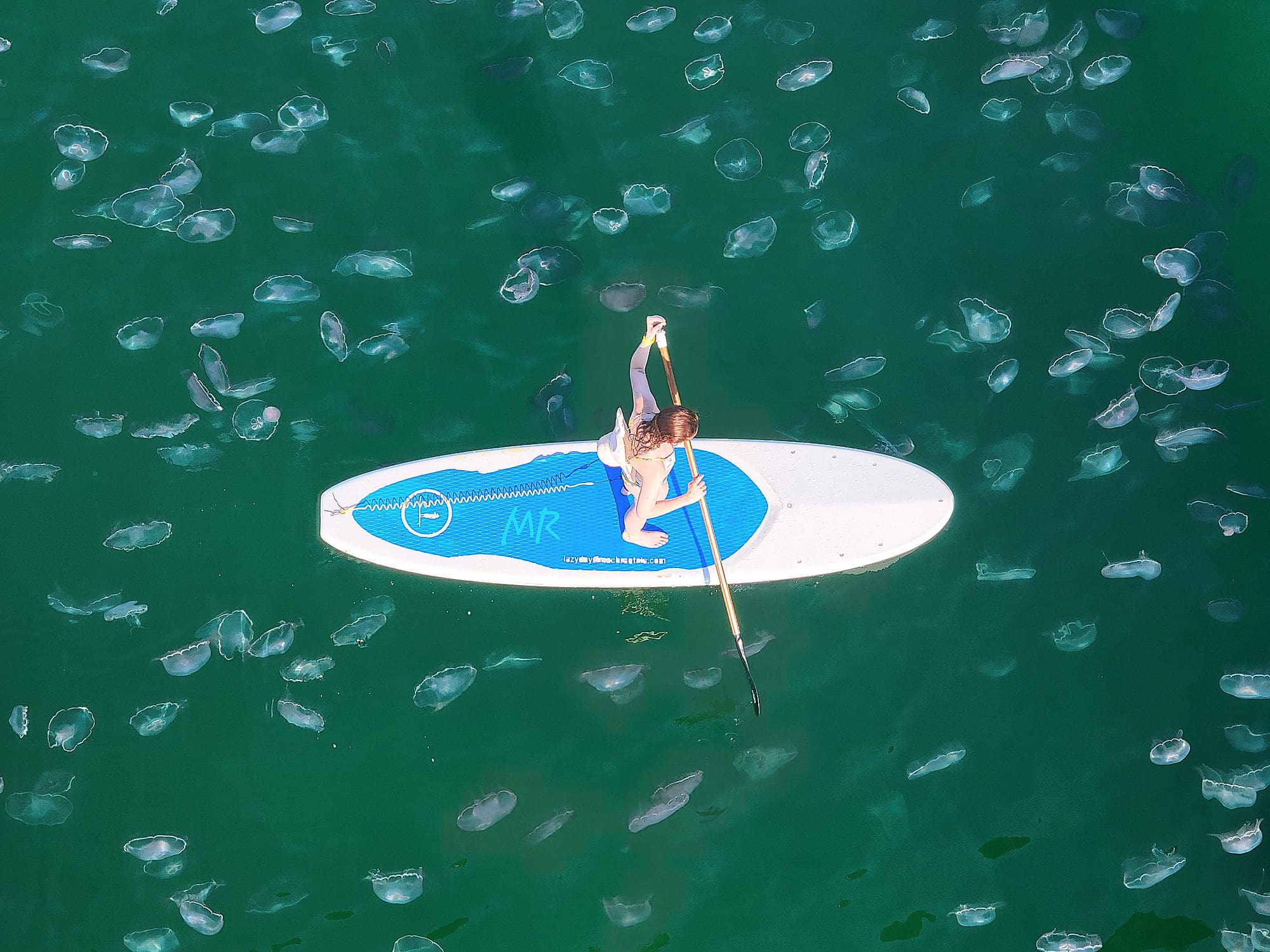 Missy Robison snapped this photo from the Navarre Beach Fishing Pier last week, as a stand-up paddleboarder paddled through a blanket of jellyfish.