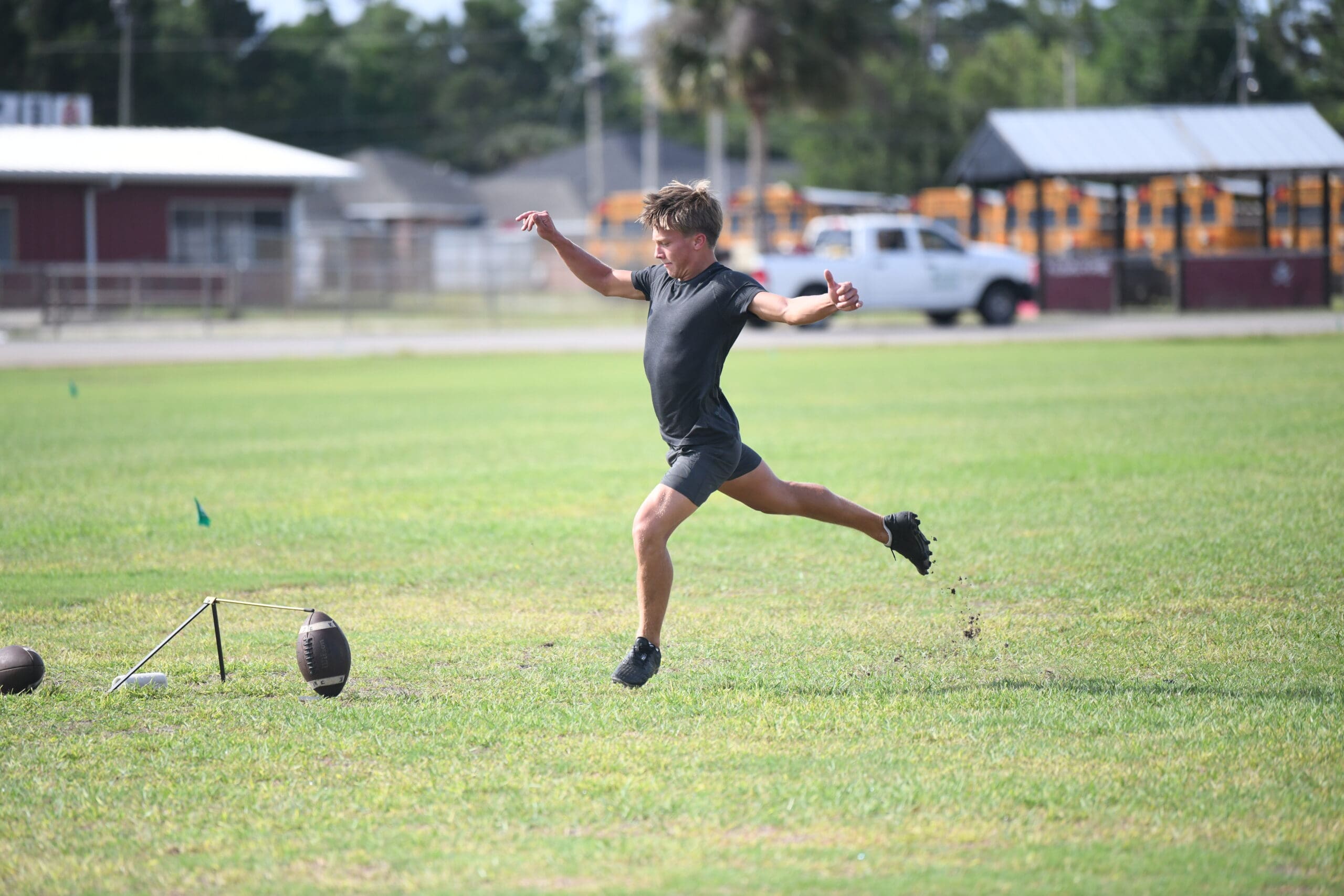 Jack Beyer is consistent in his workout. Kick after kick sails through the uprights as he practices on a hot and sunny morning inside Bennett C. Russell Stadium.
