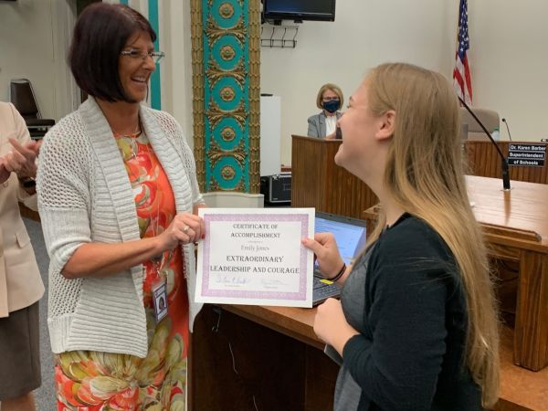 Emily Jones, 13, accepts a Certificate of Accomplishment from Transportation General Manager Virginia Sutler at the Oct. 5 school board meeting after clearly communicating to a 911 dispatcher and remaining calm during her bus driver’s respiratory emergency. Submitted photo