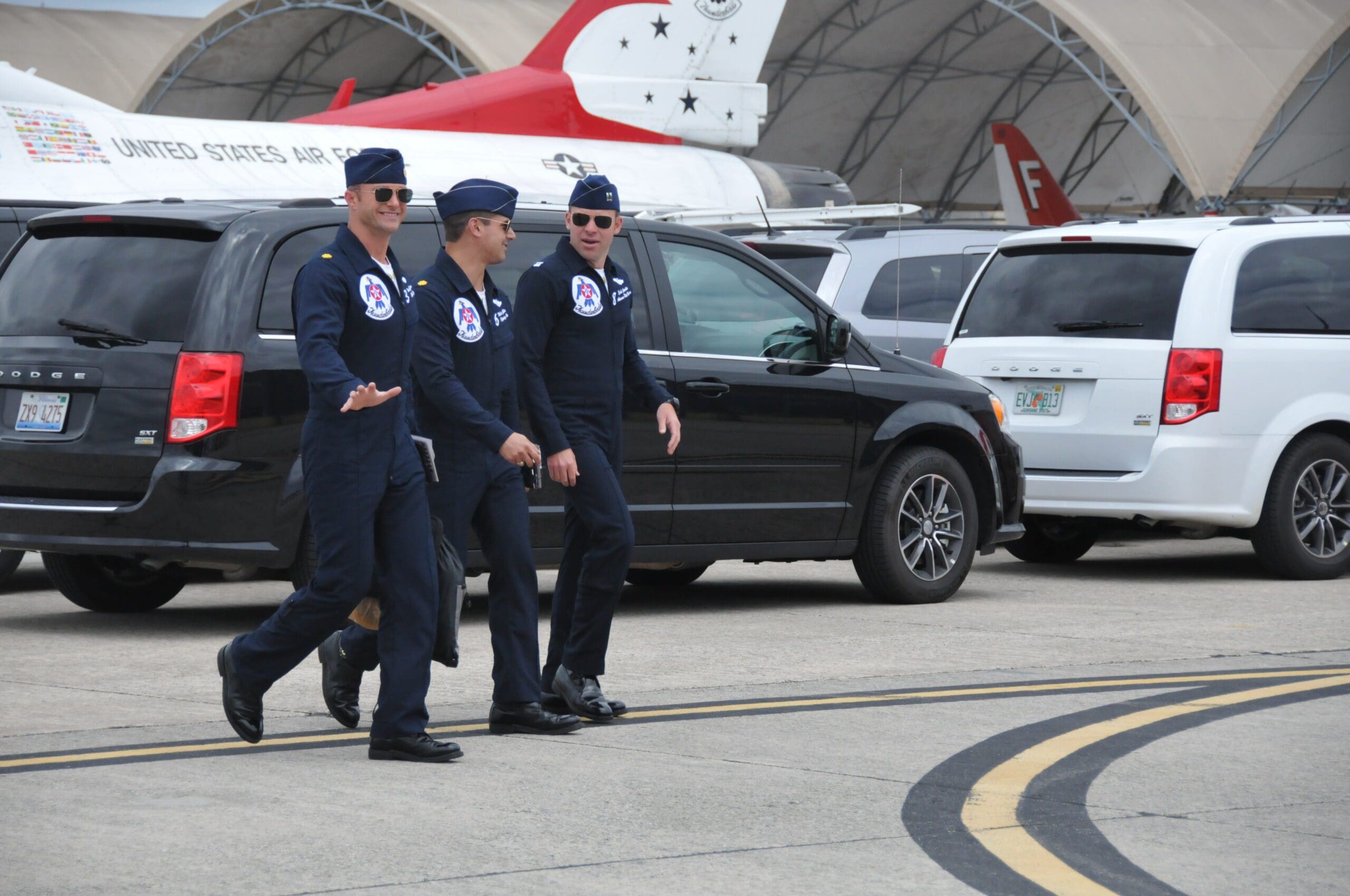 Criss-crossing a gray sky on a blustery Monday morning at NAS Pensacola, the Air Force Thunderbirds demonstration team showed off their impressive flying maneuvers in the air, the noise from their T-38 jets almost deafening and the smoke trailing off behind them and fading into the gray clouds.