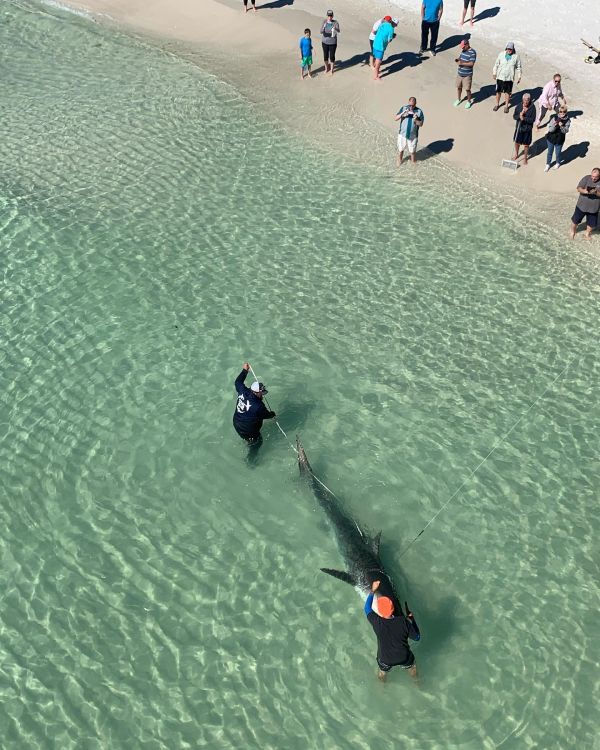 The fishermen, reportedly associated with True Blue – a self-described community of shark fishermen based in Milton – walked the fishing line down the pier and pulled the animal into shallow water, where they measured, tagged and released it, according to spectators.