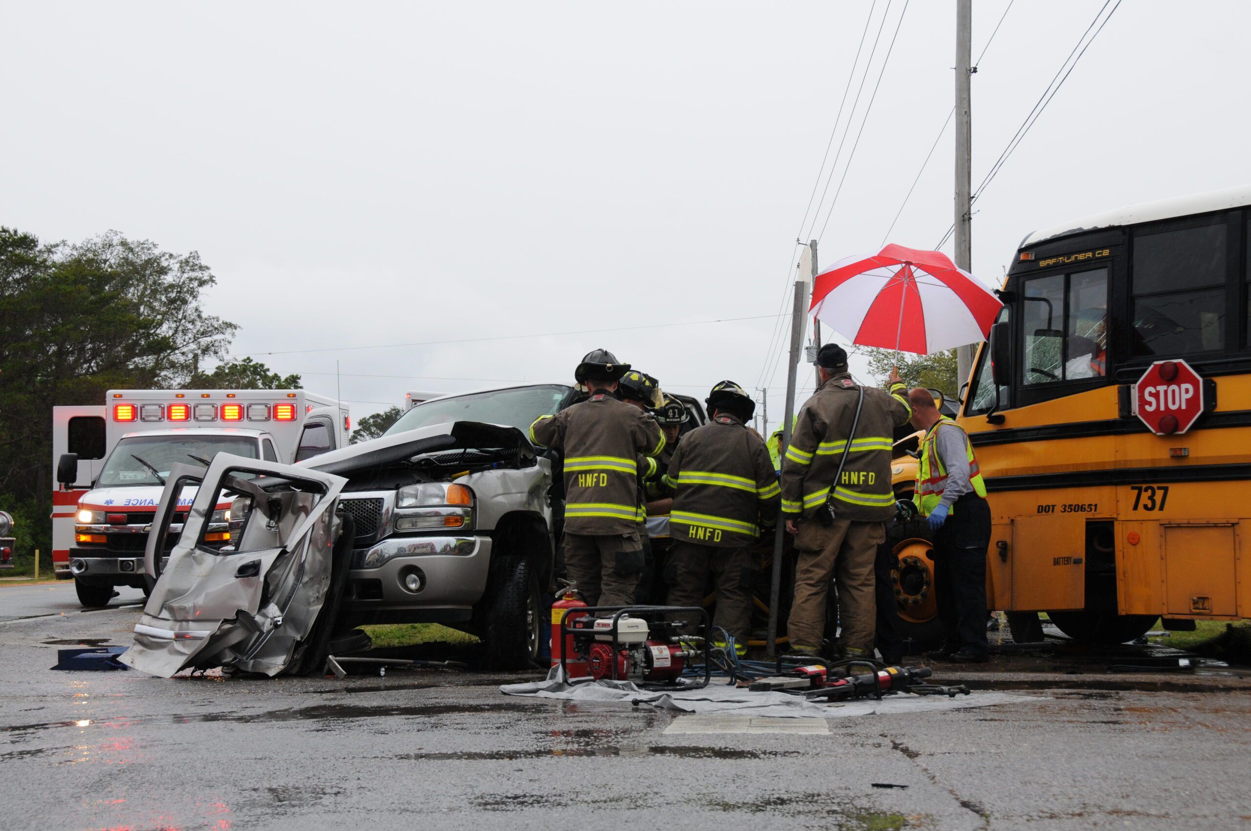 A truck collided with a Santa Rosa County school bus carrying Navarre High School students on County Road 399, near Bay Club Drive, at 3:55 p.m. April 19, in rainy conditions.