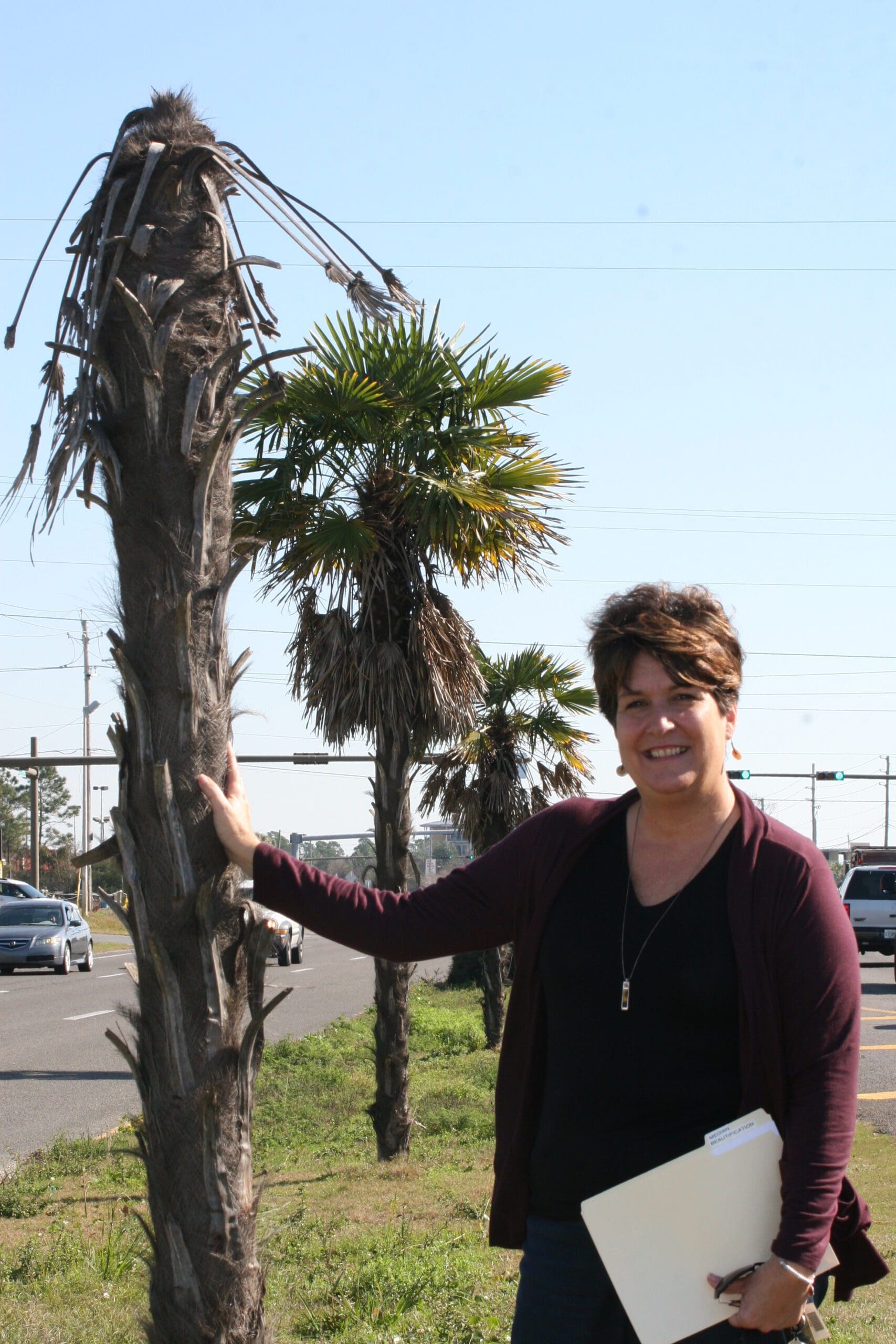 Laurie Gallup of Navarre stands next to one of the ‘sad’ palm trees in the U.S. Highway 98 median. The United Peninsula Association is working to beautify the medians to the Okaloosa County line.