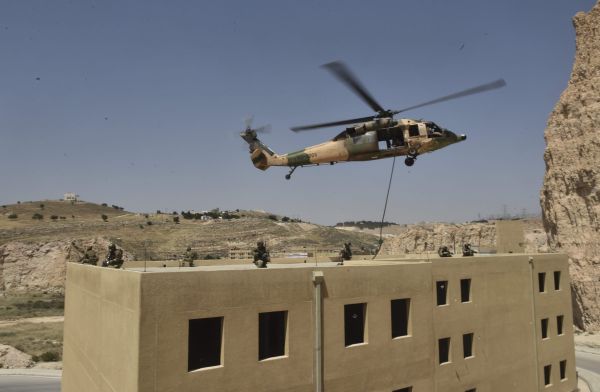 Italian special operations forces, U.S. Air Force Special Tactics and members of the Jordanian Armed Forces Special Task Force fast rope from a Royal Jordanian Air Force UH-60L Blackhawk helicopter onto a three-story building during Exercise Eager Lion May 11, 2017, at King Abdullah II Special Operations Training Center. Eager Lion is an annual U.S. Central Command exercise in Jordan designed to strengthen military-to-military relationships between the U.S., Jordan and other international partners. This year’s iteration is comprised of about 7,200 military personnel from more than 20 nations that will respond to scenarios involving border security, command and control, cyber defense and battlespace management.