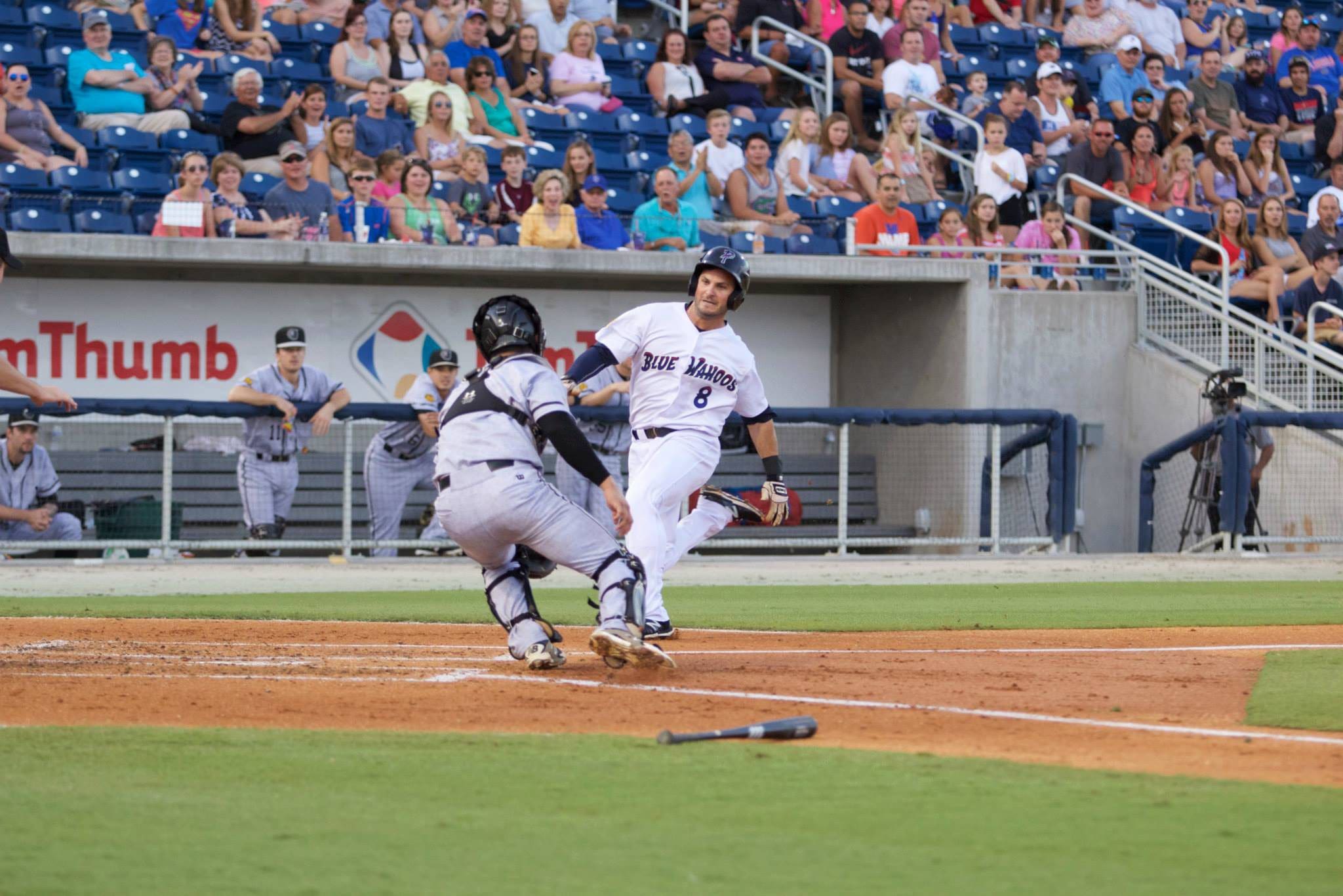Beau Amaral charges toward home plate during the Pensacola Blue Wahoos game against Jacksonville June 10.