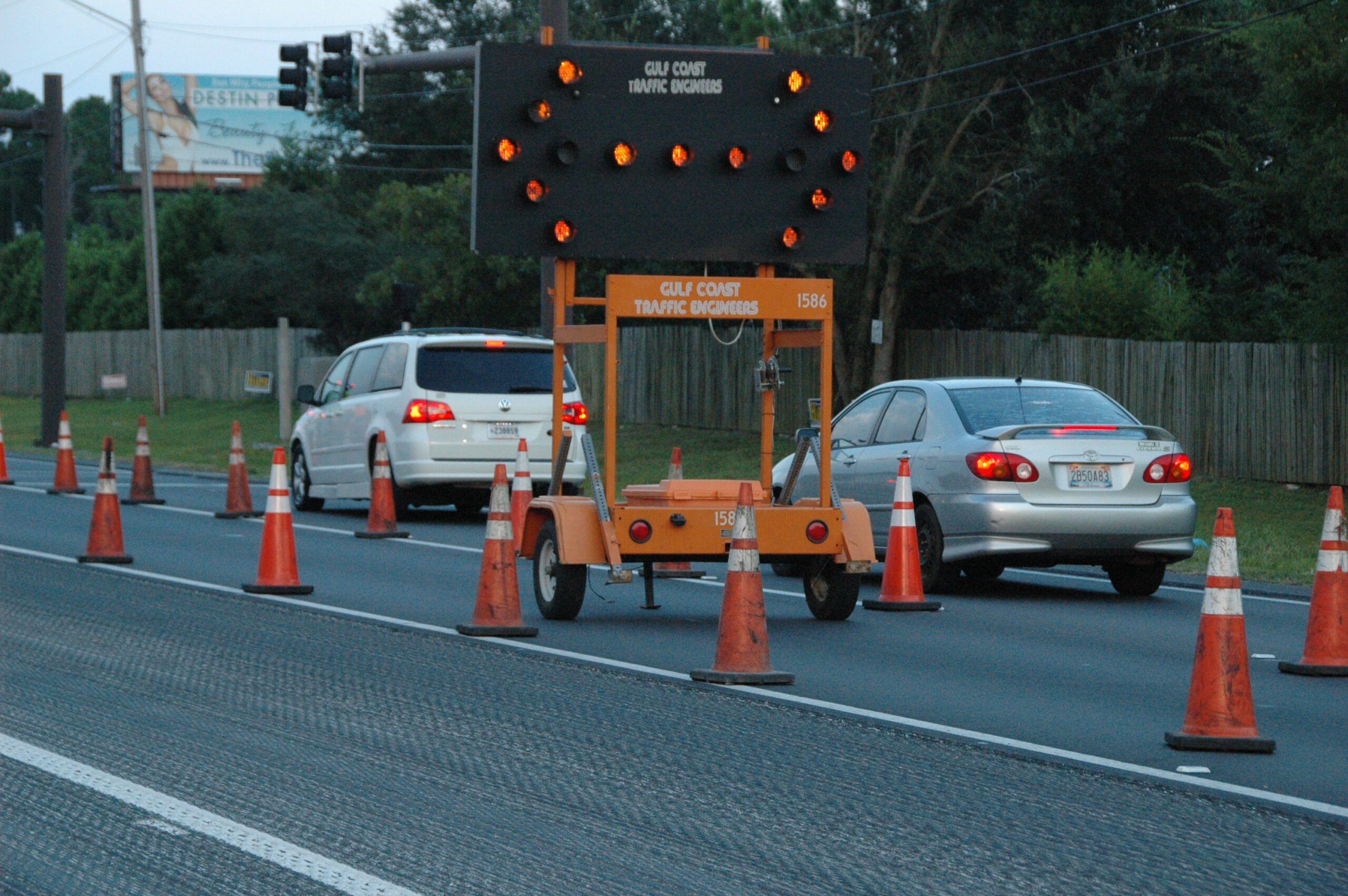 Vehicles navigate through the construction zone on Highway 98 in Navarre as crews prepare for nighttime paving activities.