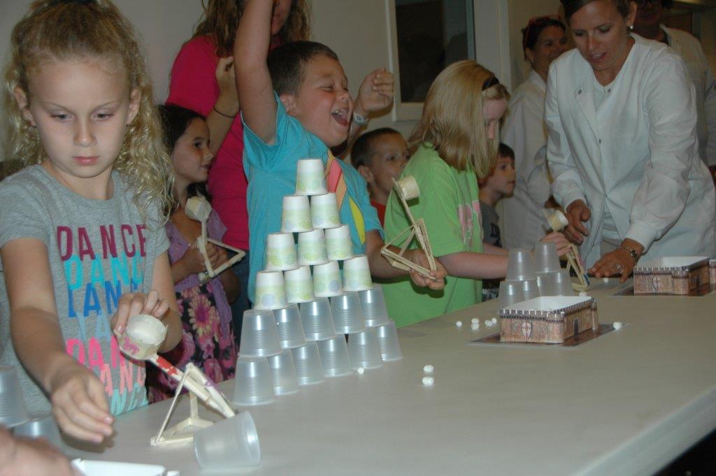 Bryce Hemphill (far left) readies her catapult during the great catapult battle during Midway Baptist Church’s Vacation Bible School.