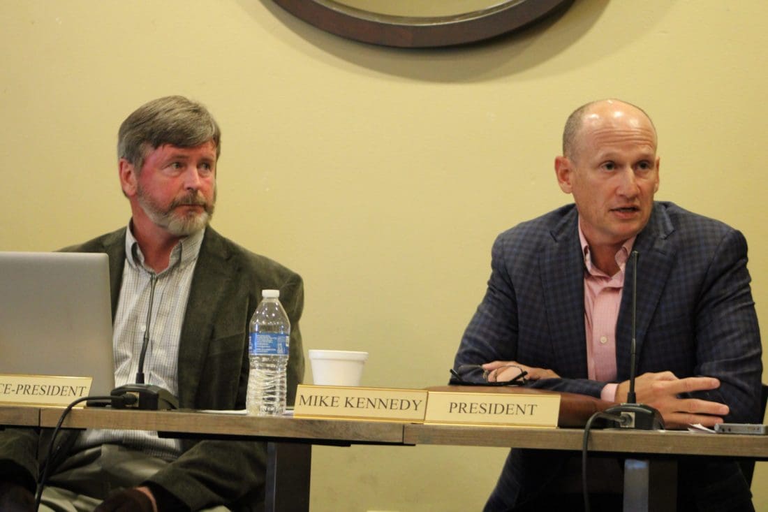 Holley-Navarre Water System Board of Directors President Mike Kennedy and Vice President Mark Miller address concerned customers during the public forum portion of the board meeting. Photo by Nick Acevedo