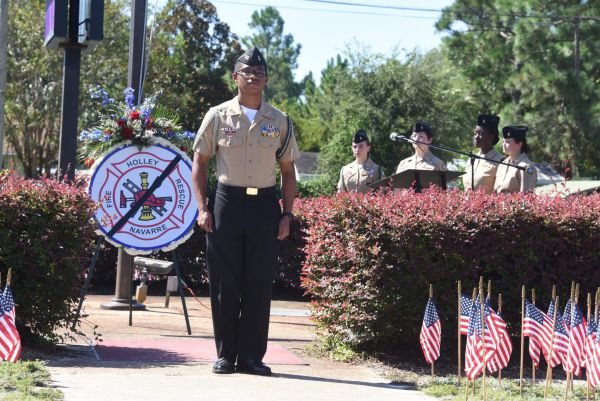 As the American flag blew in the soft breeze of a sunny, blue sky September morning, much like the one on that fateful day 20 years ago, Navarre Navy JROTC Commanding Officer Donovyn Ray spoke about the terrorist attacks that shook a nation on Sept. 11, 2001.