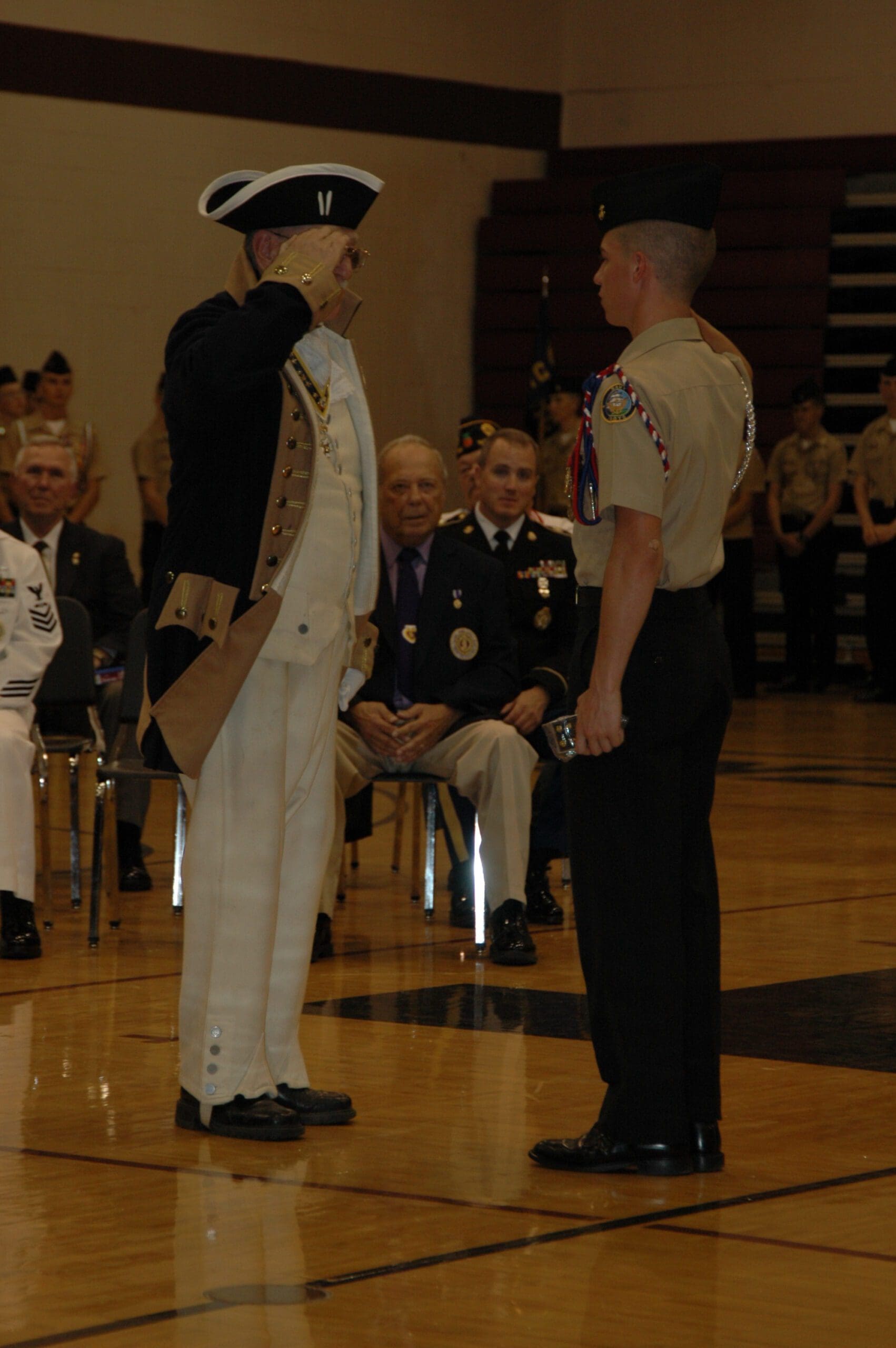 Lonnie Jones of the Aaron Snowden Chapter of the Florida Society of the Sons of the American Revolution, left, salutes Navarre High School Navy Junior ROTC Cadet Jared Bumgardner at the unit’s award ceremony last week. For more coverage of the NJROTC awards ceremony, see Page 5B.