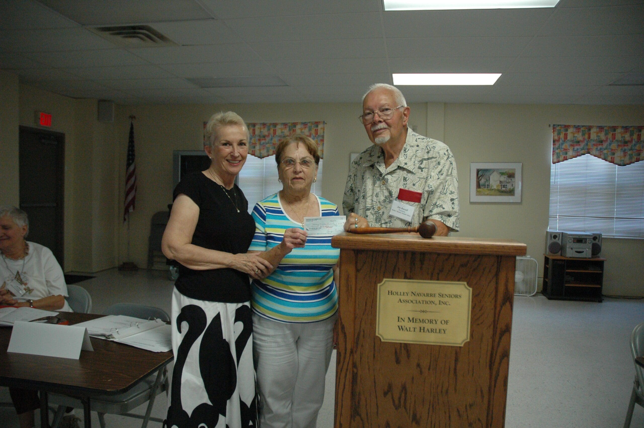 From left: Emerald Coast Woman’s Club members Cathie Stevens and Freda Campbell present a donation check to Jim Russell, President of Navarre Seniors Center.