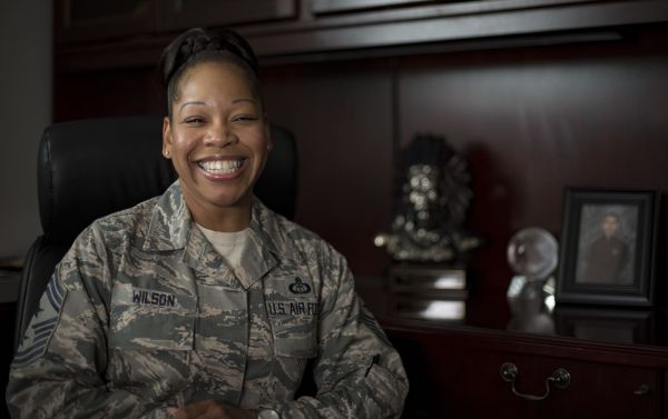 U.S. Air Force Chief Master Sgt. Yasmeen Wilson, 33rd Fighter Wing command chief, sits in her office May 9, 2018, at Eglin Air Force Base, Fla. Wilson created a motivational group for women called W.I.N.G.S., “Women Inspiring the Next Generation’s Successes,” which focuses on personal and professional development, strengthens interpersonal communication skills, heightens self-awareness and encourages self-confidence. (U.S. Air Force photo by Airman 1st Class Daniella Peña-Pavao)