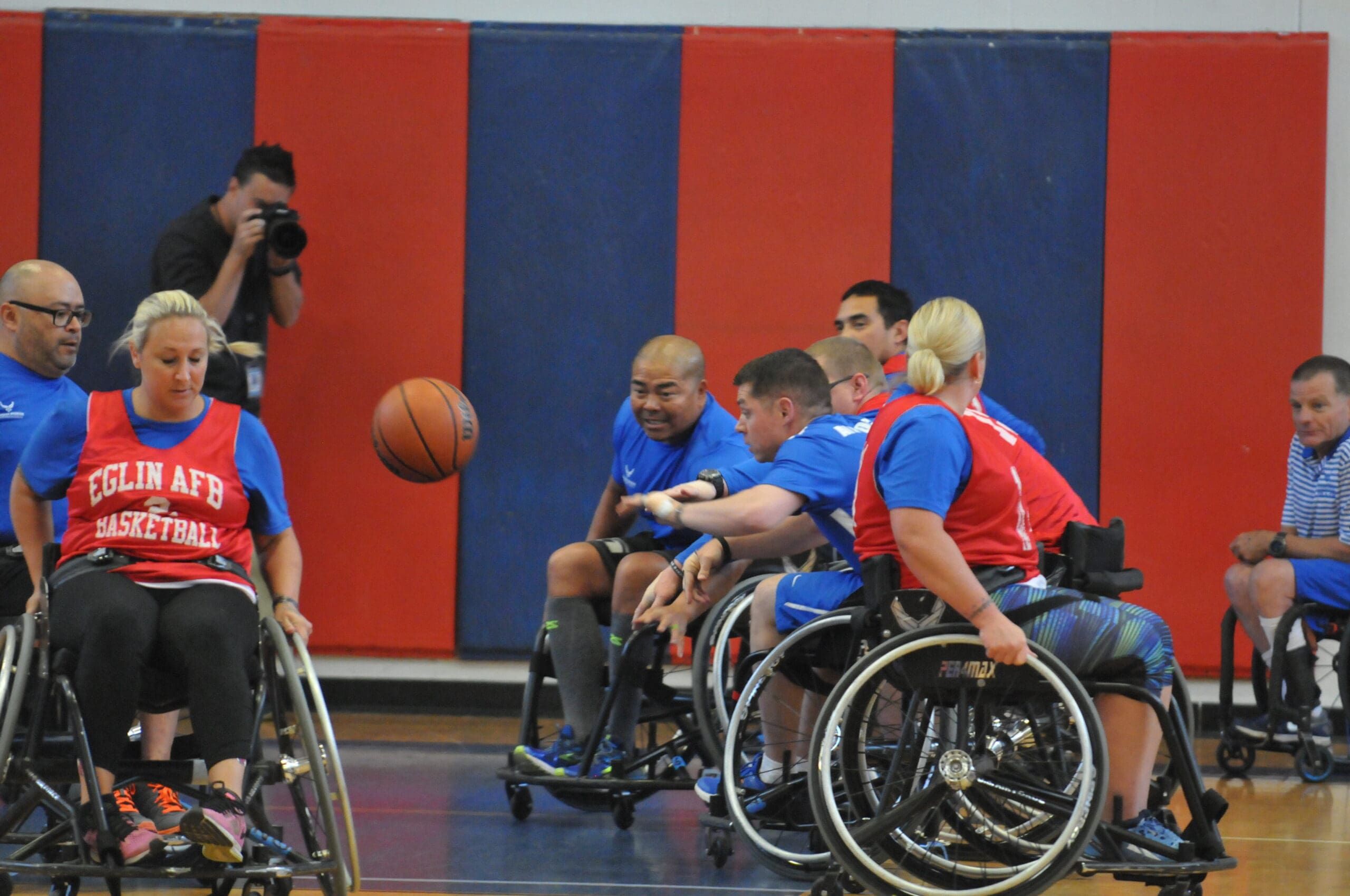 Athletes move around on wheelchairs up and down the basketball court on a Friday afternoon inside a gymnasium at Eglin Air Force Base. It’s a competitive game and there is fun involved as well.