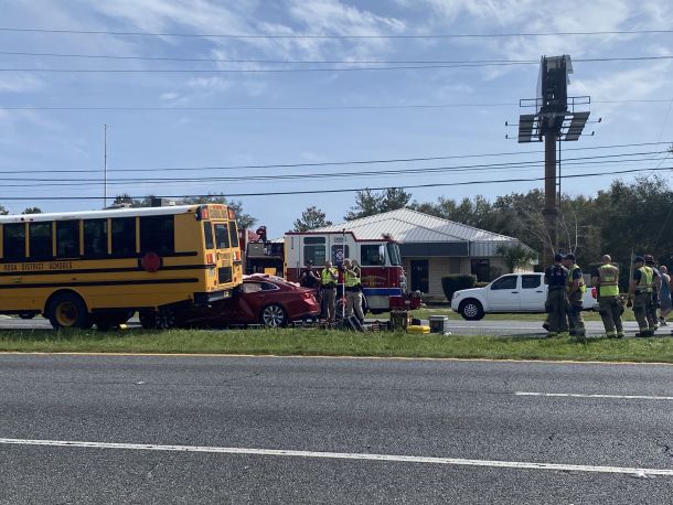 Holley-Navarre Fire District was dispatched to the scene at 1:50 p.m. and found the woman’s vehicle, a Chevrolet, partially underneath the school bus.